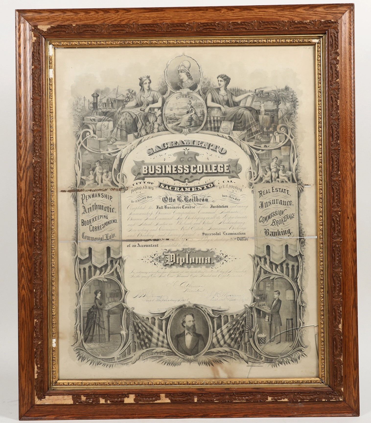 Son of wealthy cattleman August Heilborn, Otto Heilbron graduated from the Sacramento Business College, December 19, 1889 and here is his framed diploma. Frame is 28 x 34 inches, and the trim is damaged. Glass is cracked lower right corner, diploma is torn in two places from years ago. The historic Heilborn house, near the Leland Stanford Mansion, still stands as a historic marker.