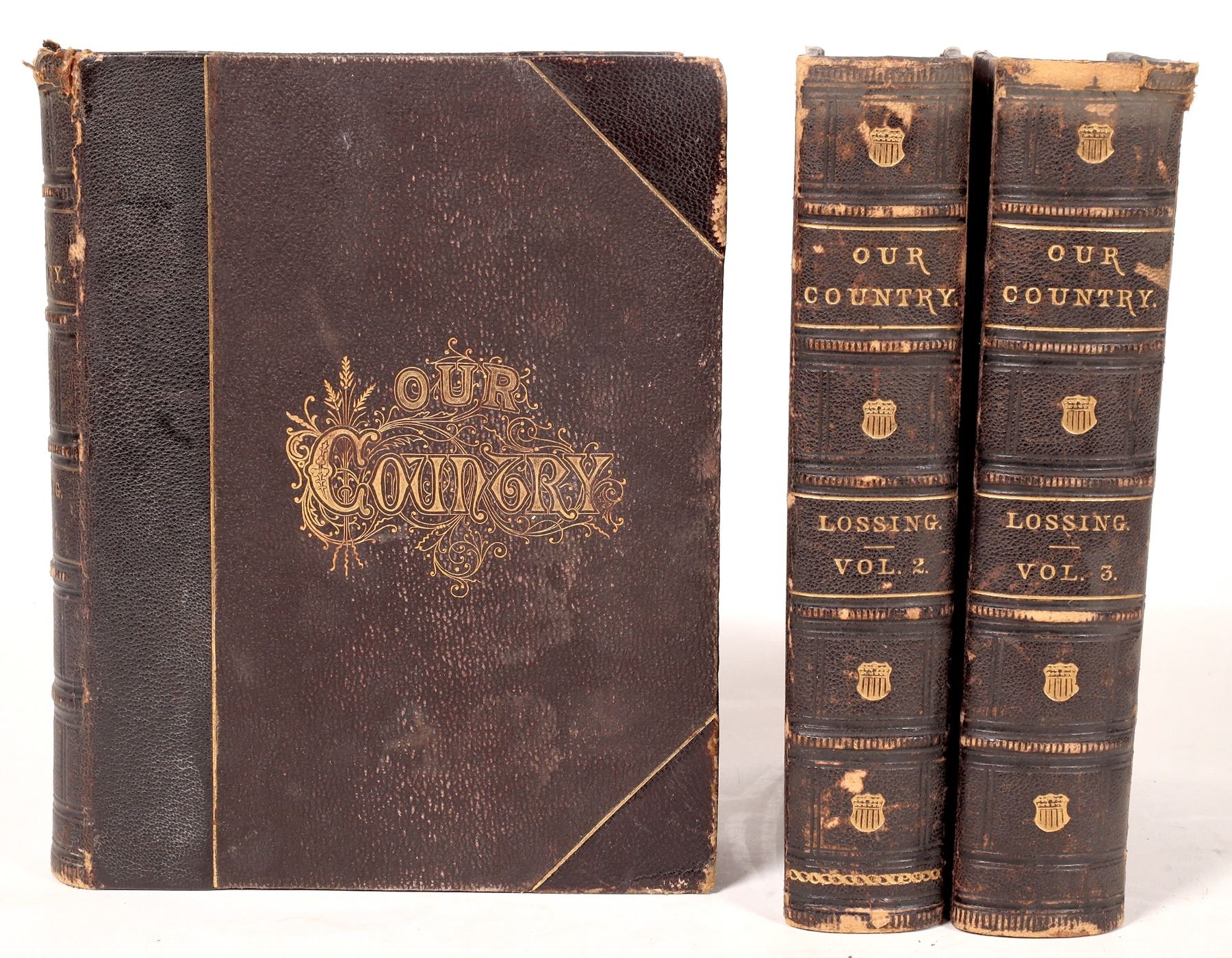 1880, 3 volumes of Our Country by Lossing. A Household History of America. Plate illustrations. Gilded binding with wear, please inspect.