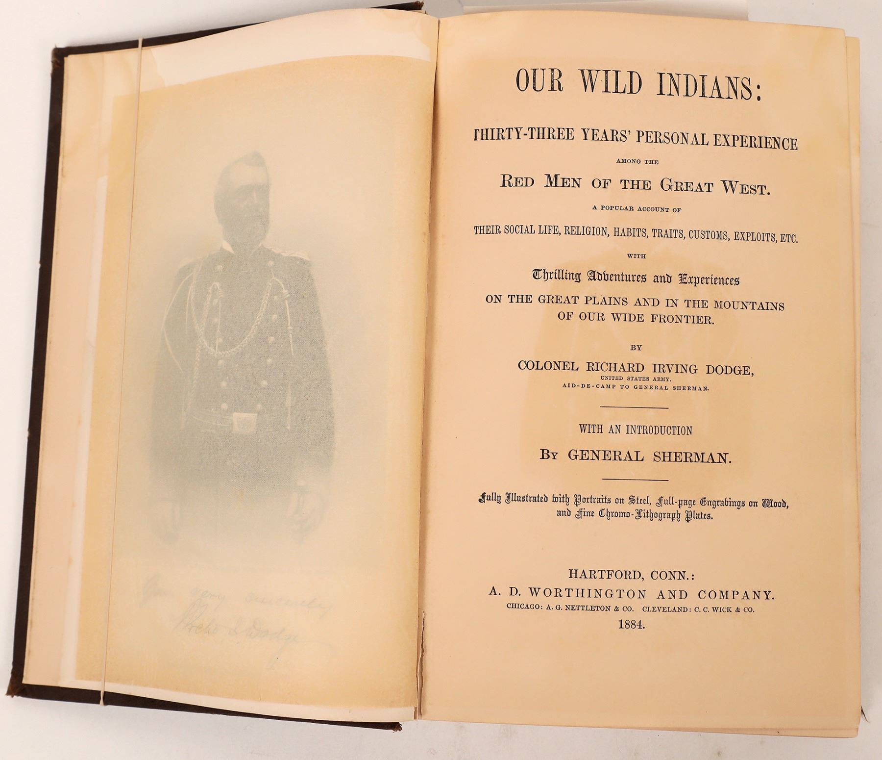 This is an 1884 book "Our Wild Indians," written by Colonel Richard I. Dodge and dedicated to General William Tecumseh Sherman. The book is 653 pages and is in nice condition, considering its age. To clarify, this is not the Colonel Dodge who Dodge City, Kansas is named for. That was Colonel Henry I. Dodge. 1884