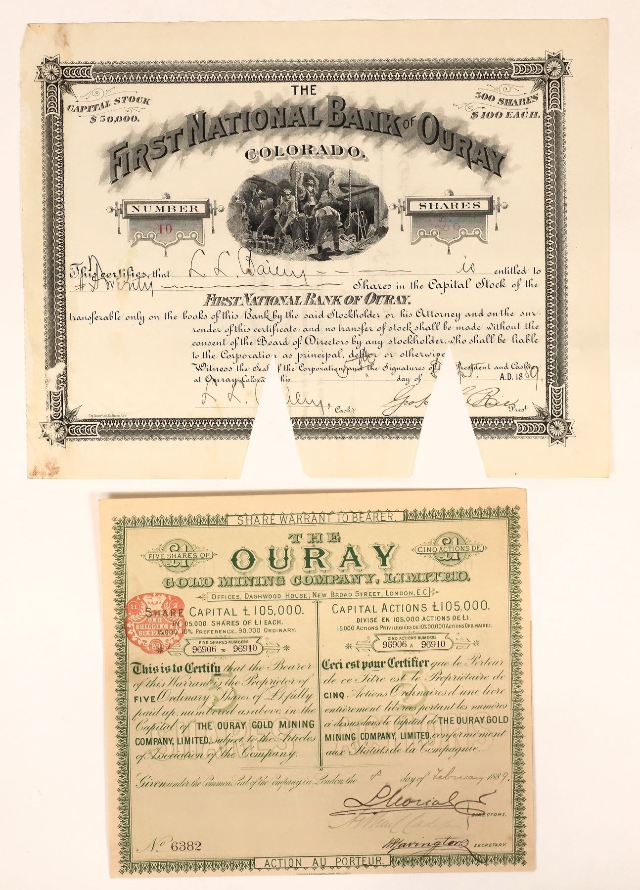 Lot of 2 different scarce certificates. 1) The Ouray Gold Mining Company, Limited. Issued for 5 shares in 1889 in London. Signed by two directors and the secretary. Not cancelled. Green border and print, foreign revenue imprint. 12 x 8" with coupons. The company was registered in 1887 to acquire and work the group of three gold, silver and lead mines, 4 miles from Ouray known as El Mahdi, Dexter No. 2 and Mugwump (Skinner, 1888). The company was successful enough to declare a 10 cent dividend in 1888. 2) First National Bank of Ouray. Stock no. 10, issued for 20 shares to cashier LL Bailey in 1889. Signed by president Price and Bailey. Signatures cut out (as often seen with these). Black border and print, underground mining vignette. 8.75 x 11" Price opened the bank in Sept. 1889 and suspended operation July 1st, 1893 during the 1893 Silver Crisis. When it reopened, it was re-named Bank of Ouray. It filed for bankruptcy in 1907.