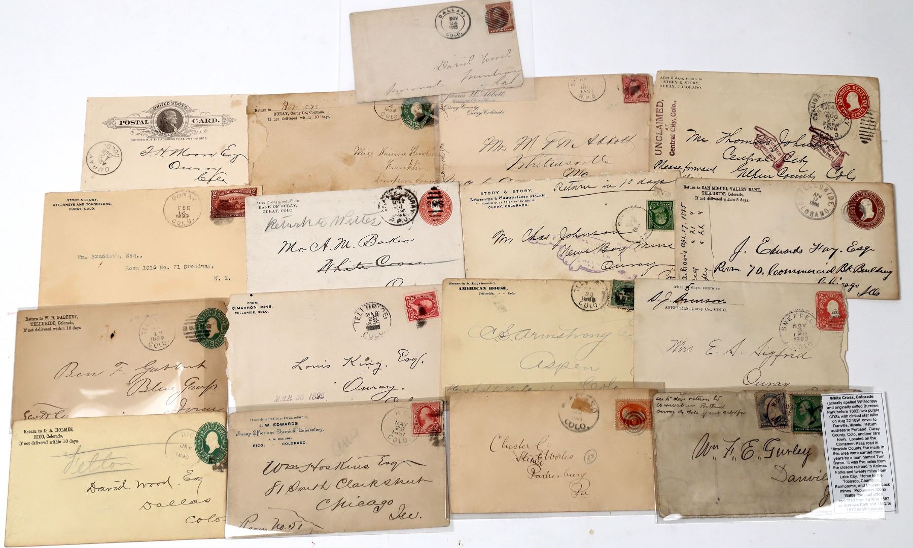 Lot of 17. 1) Portland. Two pieces: White Cross cover with two purple CDSs with circled star killer, 1891, return address is Portland, Ouray County; and 1884 cover with Portland cancel. 2) Rico. Two covers: corner ad cover for JW Edwards, Assay Office, 1891; and cc for DA Holmes, 1890. 3) Sneffels. One corner cover , 1903. 4) Dallas, Colo. 1885 cover. PO operated 1884-1899. 5) Telluride. Four corner covers: American House 1880s; Cimarron Mine, 1895; WH Gabbert, 1889; and San Miguel Valley Bank, 1885. 6) Ouray. Six corner covers and one postal card: Story & Story, 1890s and 1908; Bank of Ouray, 1902; James W. Abbott, 1893; 1888 cover; and 1888 postal card to Ouray. Please inspect.