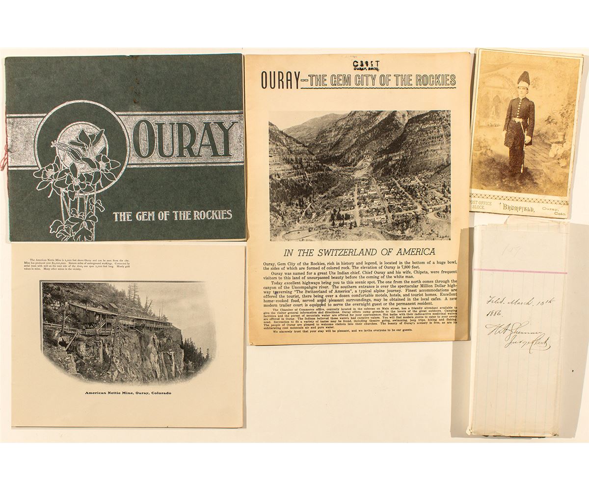 1) Hand written Election Notice, 1886. "A call for an election to vote for or against the incorporation of the same as an incorporated town to be know as Town of Portland". Filed on March 15, 1886 by W. A. Sherman, Judge's Clerk. 2) "Ouray, the Gem of the Rockies". Published by the Ouray Board of Trade, Ouray, Colorado, 1903. Picture album of Ouray and the surrounding Rockies. (7" x 9") 24 pp. dark green cover, Gold design. Good condition. 3)"Ouray--The Gem City of the Rockies, In the Switzerland of America". Published by the Ouray County Chamber of Commerce, Ouray, Colorado. Tourist brochure, with 2-page map in the center fold. (11" x 8.5) 12 pp. 4) BPhotograph of a a mandressed in a uniform of a soldier. bottom of card: Post Office Block. Brumfield, Ouray, Colo. Photo is faded, with foxing.