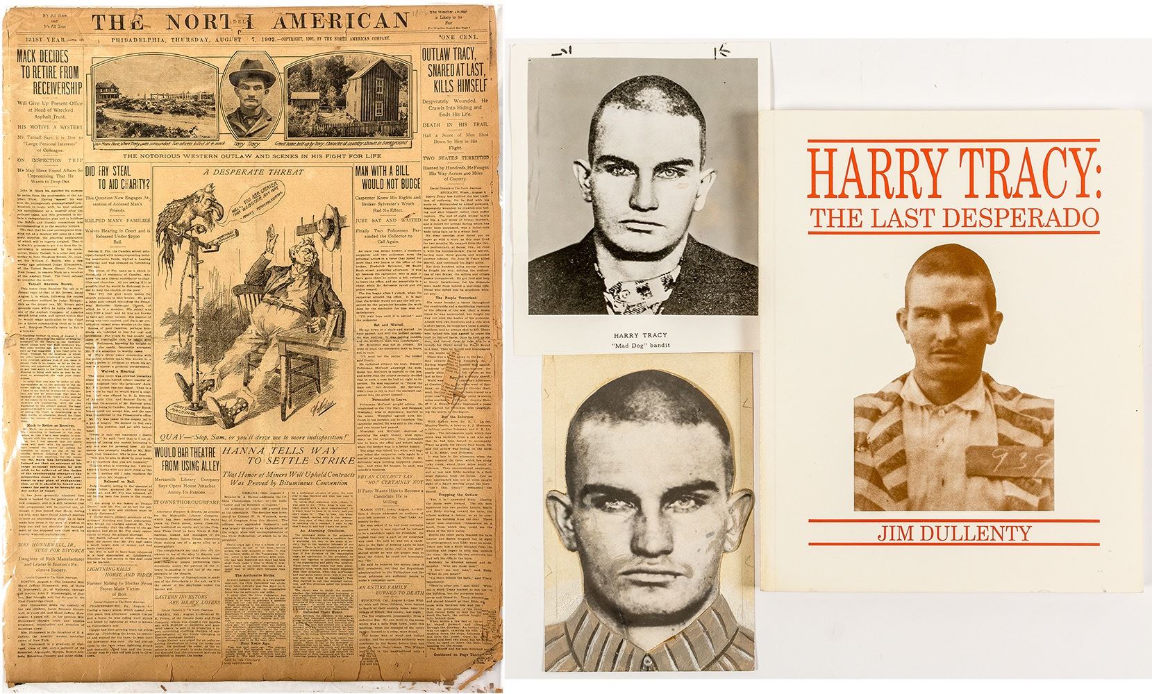 Large newspaper with front page photos and article "Outlaw Tracy, Sanred at Last, Kills Himself," dated August 7, 1902. Comes with two photos of Tracy. Also comes with the 1989 book "Harry Tracy: The Last Desperado," with lots of photos including Tracy's morgue photos. State: City: Date: ID# 48945