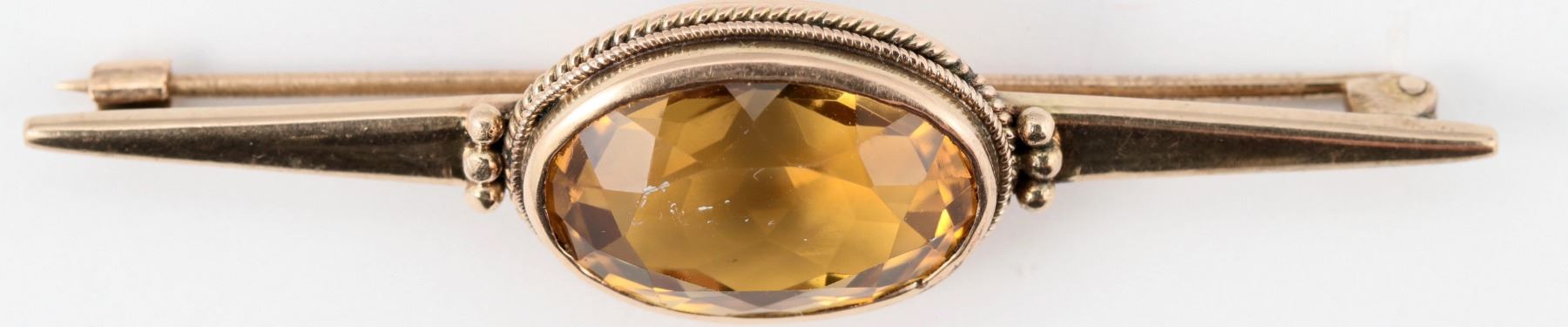 10K gold vintage cut oval citrine brooch--stone is .75"x .5", set in 2.5" long brooch. Very elegant piece.