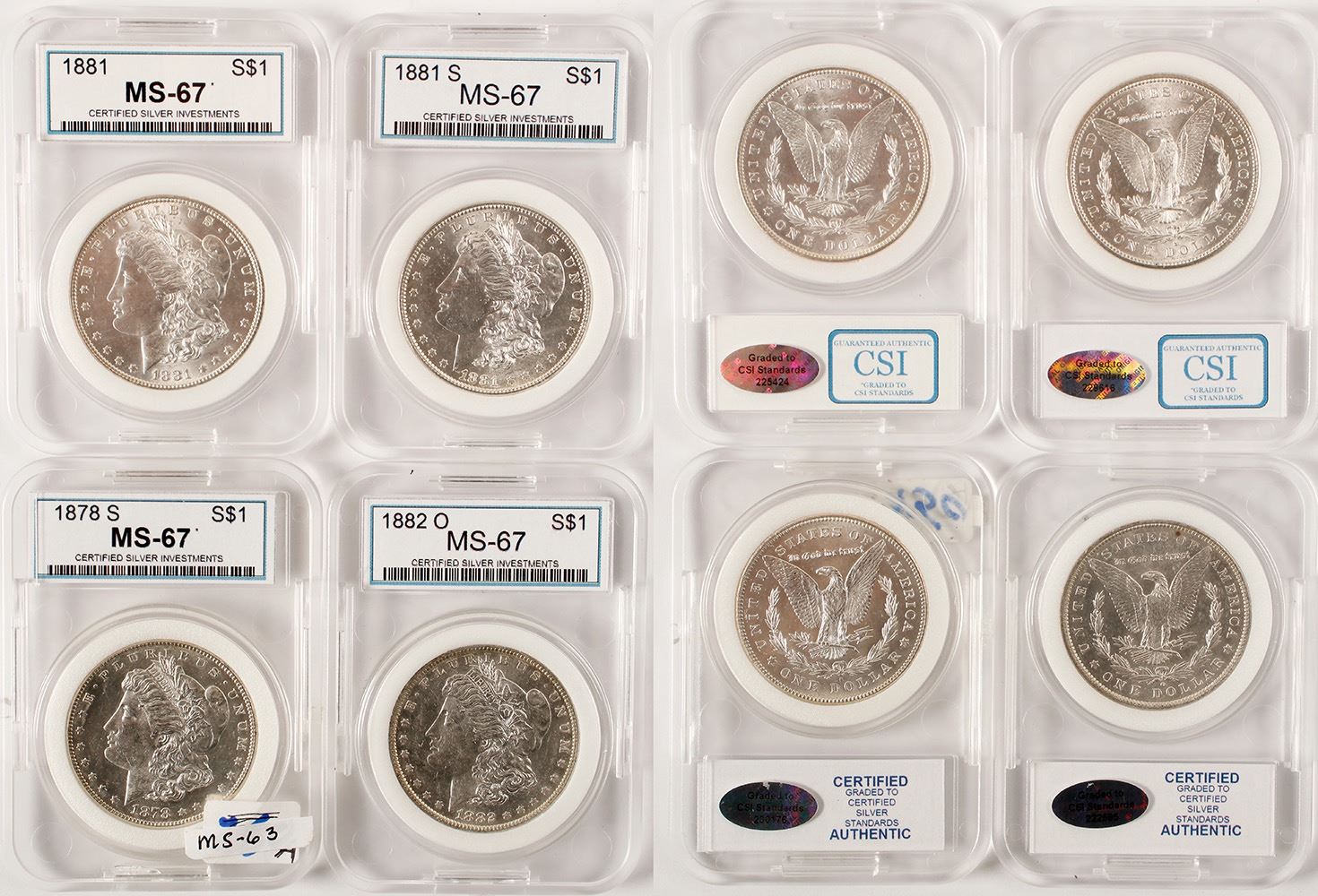Four uncirculated Morgan Dollars slabbed in "Certified Silver Investments" cases, all graded MS-67. We can assure you these are not MS-67 coins, but they are nice uncirculated Morgans. 1878-S, 1881, 1881-S, 1882-O. Worthy of inspection. Date: Location: HWAC# 58125