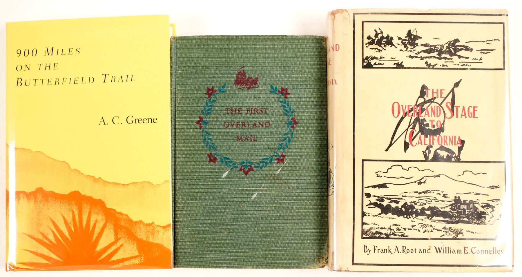 Three hardcover volumes. The Overland Stage to California by Root, The First Overland Mail by Pinkerton with lower page corner damage, 900 Miles on the Butterfield Trail by Greene, very good condition. State: City: Date: