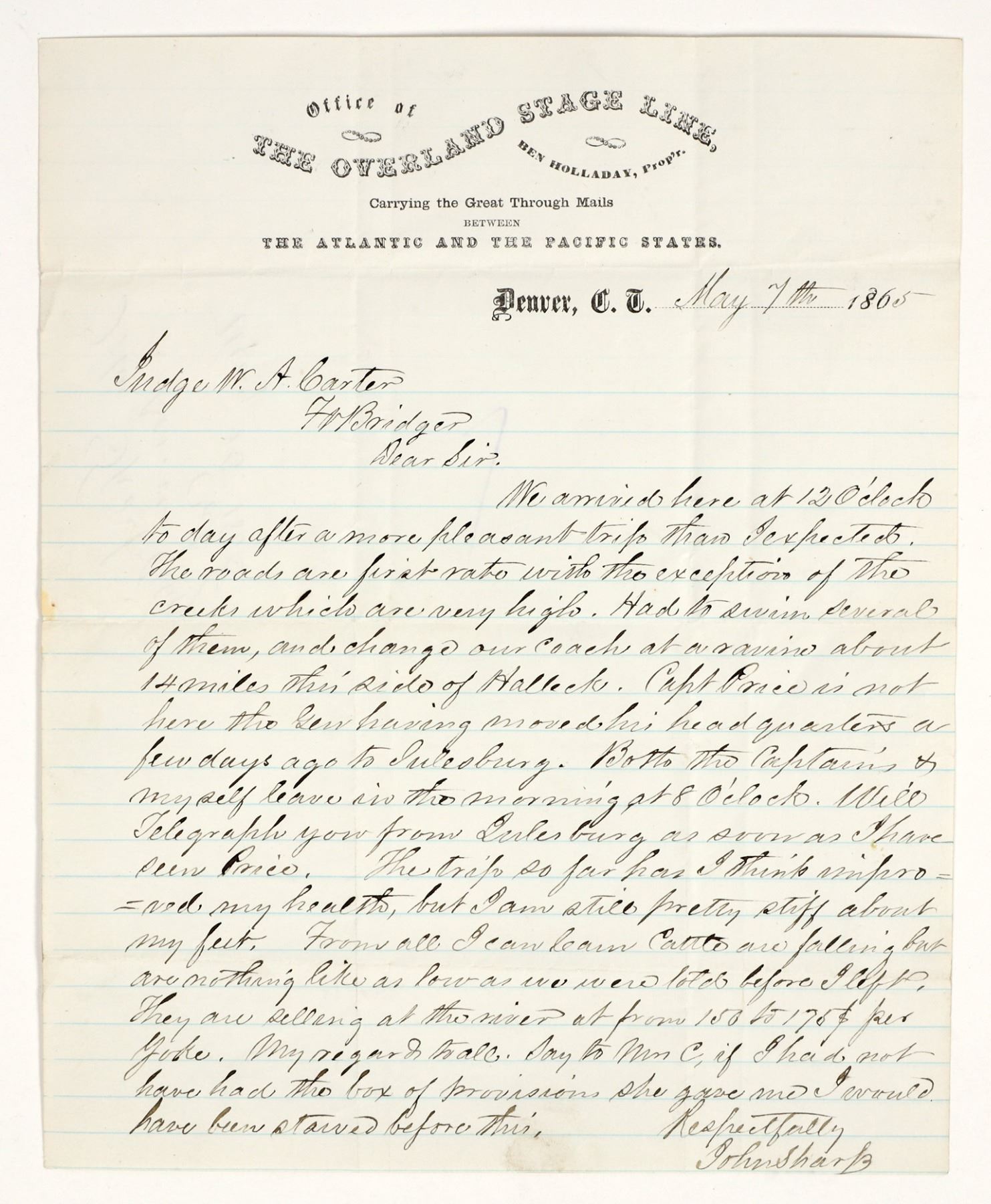 Very rare letterhead that lists Ben Holladay as proprietor. Addressed to Judge WA Carter, Ft. Bridger. Message details the trip: creeks running high, "had to swim several of them, and change our coach at a ravine about 14 mile about 14 miles south of Halleck..." "Capt. Price is not here, the Gen. having moved his headquarters a few days ago to Julesburg...." Signed John Sharp, which may be Colonel John Sharp involved in the Utah Black Hawk War of 1865-71 as part of the Northern Militia. 10 x 8" Fort Halleck, established in 1862 near Elk Mountain in what is now Wyoming, was a small U.S. Army post built to protect travelers and stage stations along the Overland Trail during the Civil War era. Though active for only a decade, it served as a critical guard post against raids before being abandoned in 1870 when the Union Pacific Railroad shifted travel away from the trail. W.A. Carter was the post trader at Fort Bridger beginning in 1858. Along with his family, Carter lived at the fort, rebuilding and stocking it and eventually becoming Wyoming's first millionaire.
