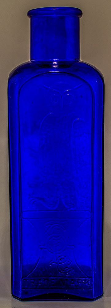 The large-size Square cobalt Owl drugstore bottle. 9.75" tall 3" wide. Single panel embossed with an owl with the wing on the right sitting atop the usual mortar and pestle. WT & Co. on the base. Light staining on top shoulder and inside. Never professionally cleaned. Choice.