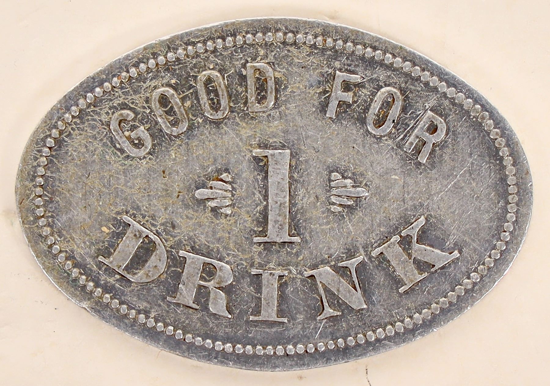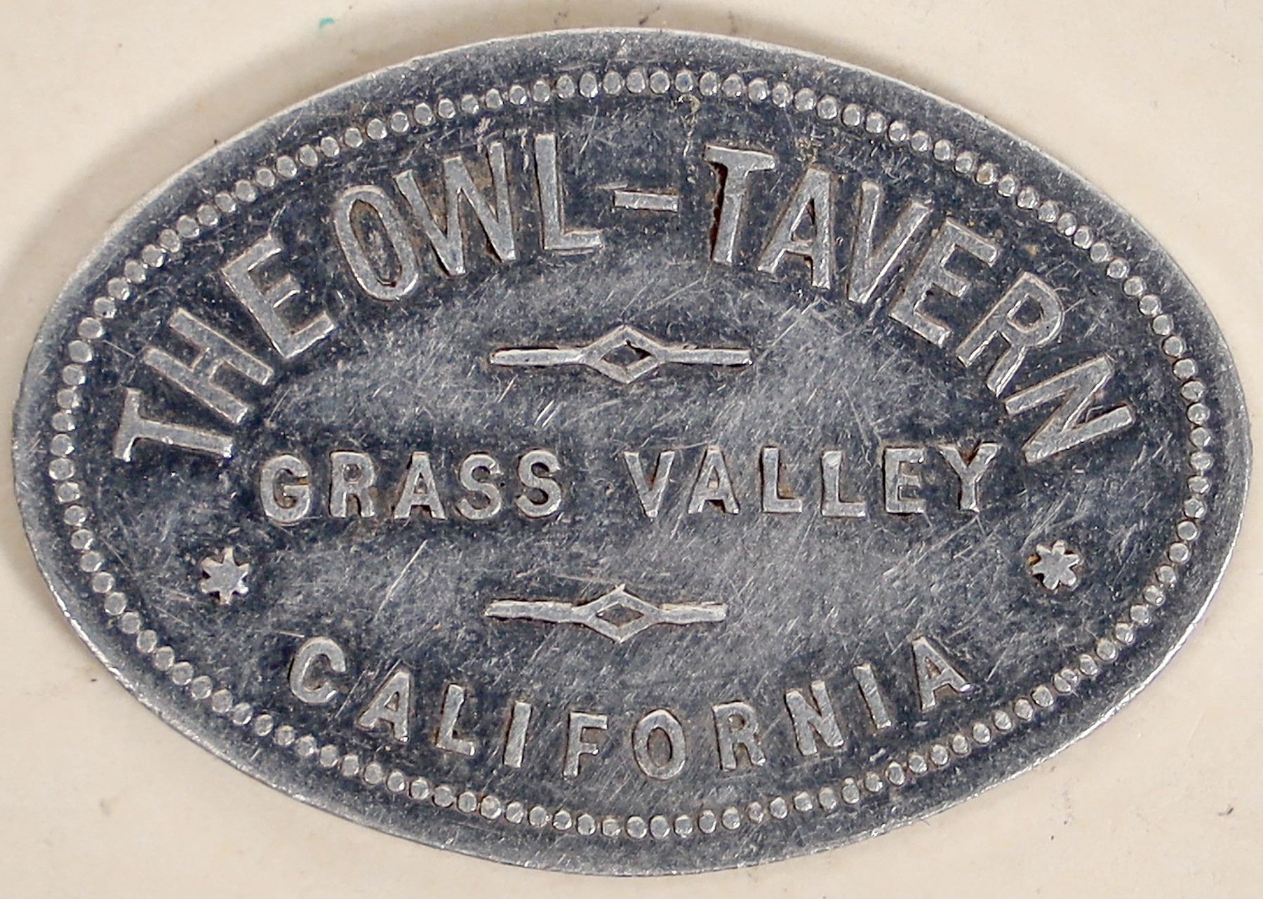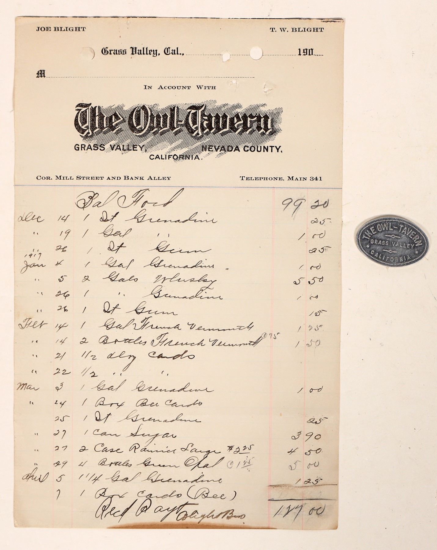An oval GF one drink token at The Owl Tavern in the Gold Rush Nevada County town of Grass Valley. The tavern was founded in 1852 and is still going strong. There is also a letterhead of what appears to be a bill for various items, including whiskey, beer, playing cards and more. Nice duet of historical prices from an historical establishment. Please see photos for more details.