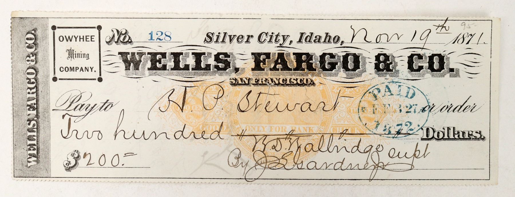 1871 Wells Fargo & Co. check with imprinted Good Only For Bank stamp.