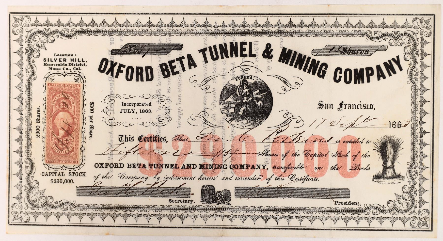 Oxford Beta Tunnel & Mining Company stock certificate, Aurora, 1863. Location: Silver Hill, Esmeralda District, Mono Co., Cal. (printed to the left of the tile). Inc. July 1863. Certificate No. 97, issued for 15 shares to George C. Perkins on September 17, 1863 in San Francisco. Signed by C.C. Knowles as president and George H. Peck as secretary. Not cancelled. Black border and print, red underprint. Small California state seal vignette (center), dog next to safe (bottom center), and bushel of hay (bottom right). No printer listed. Adhesive revenue stamp on left. Folds, minor wear. 5.5x10".