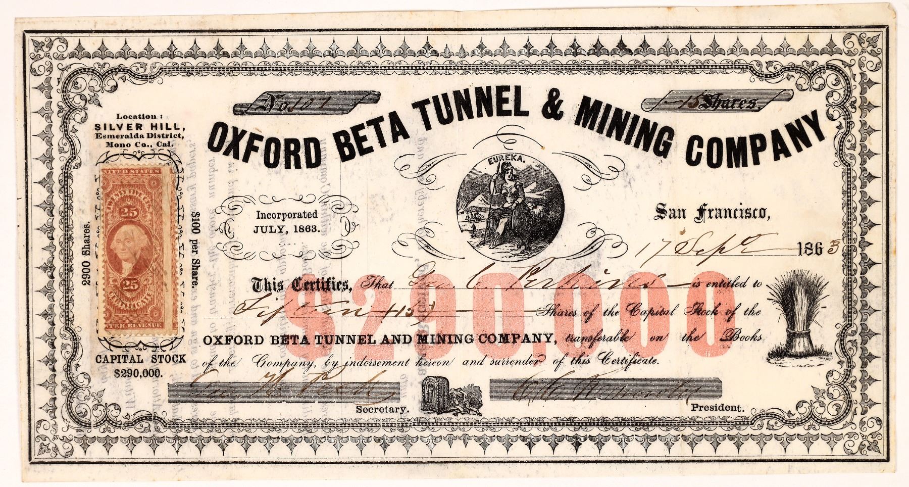 Location: Silver Hill, Esmeralda District, Mono Co., Cal. (printed to the left of the title). Inc. July 1863. No. 107, issued for 15 shares to Geo. C. Perkins on Sept. 17th, 1863 in San Francisco. Signed by president C. C. Knowles and secretary Geo. H. Peck. Not cancelled. Black border and print, red underprint. Small California state seal vignette (center), dog next to safe (bottom center), and bushel of hay (bottom right). No printer listed. 25 cent US revenue stamp on left side. Deep folds, adhesive repair on reverse over stamp.5.5 x 10" Although the certificate says Esmeralda District, Mono Co. it was actually in Nevada. California claimed this rich gold and silver ore area when their neighbor (Nevada) had no official government. The governmental structure of the area had disappeared when the Mormons left. When the Territory of Nevada was created, it still took time for any official government to be created. An official survey in 1864 finally confirmed beyond all doubt that Aurora was in Nevada. The Oxford appeared in local newspapers from 1863 until 1867. They never let in a visitor or let out ore samples. In 1867 they sent some ore samples to Virginia City - they didn't have the value they hoped for! [from Gold Hill News] C. C. Knowles was a leading dentist in San Francisco.