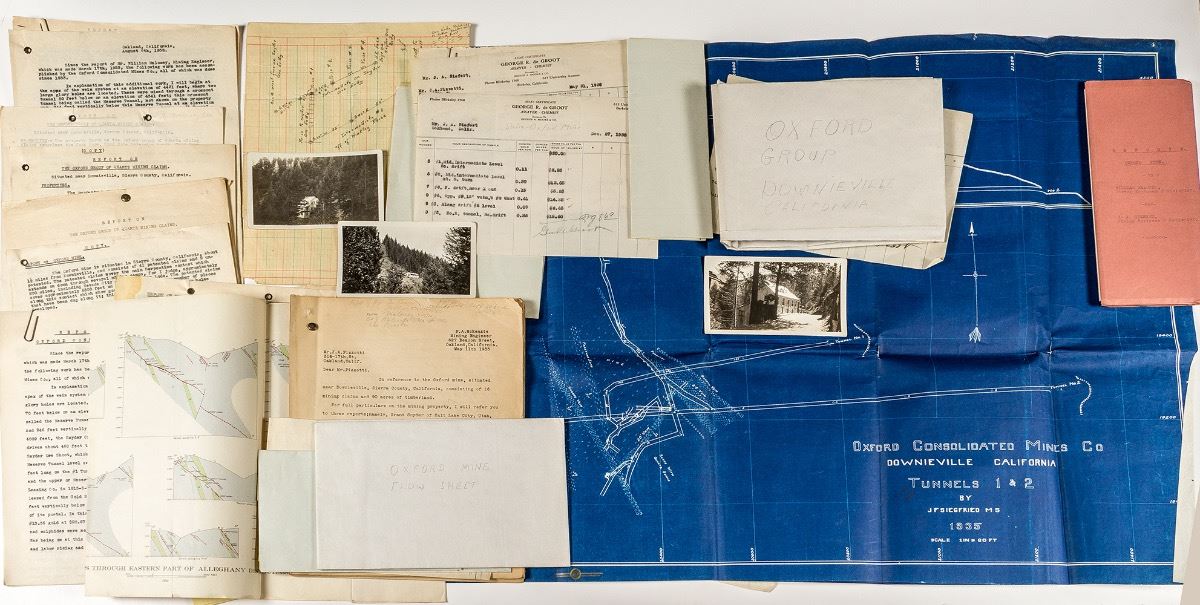 Archive includes: a 1935 blue and white schematic drawing of Oxford Consolidated Mines Co. Tunnels 1 & 2, measuring 30 x 21 1/2"; a map "showing part of the Alleghany and Downieville Mining Districts" by F. & R.F. Taylor, measuring 8 x 18"; two cross-sections of the Oxford Mine, hand-colored, each measuring approx. 18" x 11 1/2"; a schematic "Flow Sheet", measuring approx. 22" x 23"; late 1930s assay receipts from Berkeley; a 1938 report of the Oxford Mine by Maloney and Siefert; a 1935 blue and white schematic drawing "Surface Plan", measuring approx. 26" x 35" with color notations; three black and white photographs, one labeled "headquarters" and another "assay office"; a hand-drawn and colored geologic cross-section, measuring 8 1/2" x 11"; a USGS plate showing geologic cross-section of eastern part of Alleghany District, measuring 27" x 12"; various letters and copies of reports. City: Downieville State: California Date: hwac# 20279