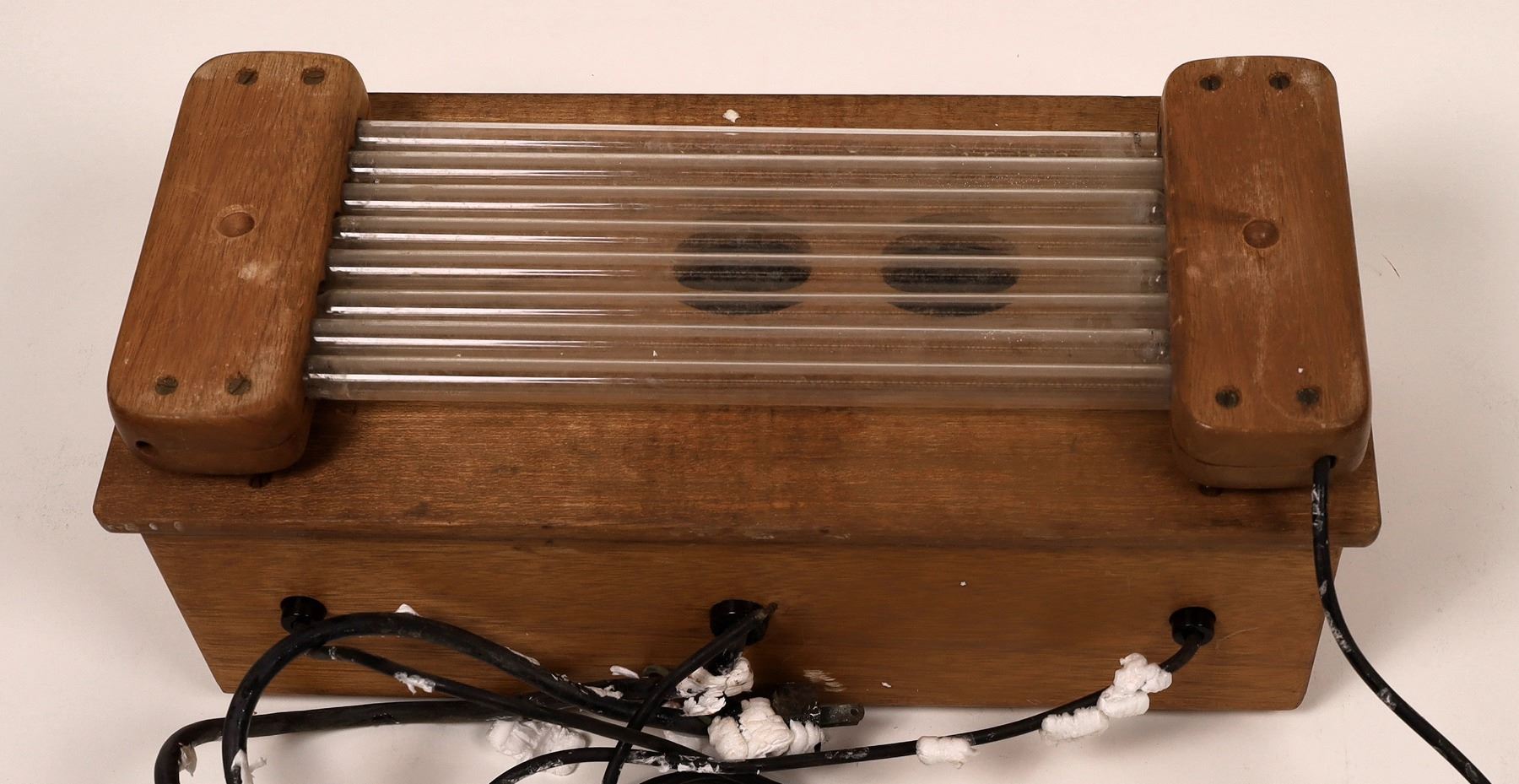Tabletop Mounted Ozone Generator by Cal Ozone, Brea California. Aluminum label on side. Wood box construction with delicate 8 glass tube device attached. Overall 18 x 8 x 6 inches. NOTE: Not for home use. Ozone can cause injurious inflammation of the lungs and respiratory system, and it is possible for ozone generators in the home to kill pets. Sold for historical interest only.
