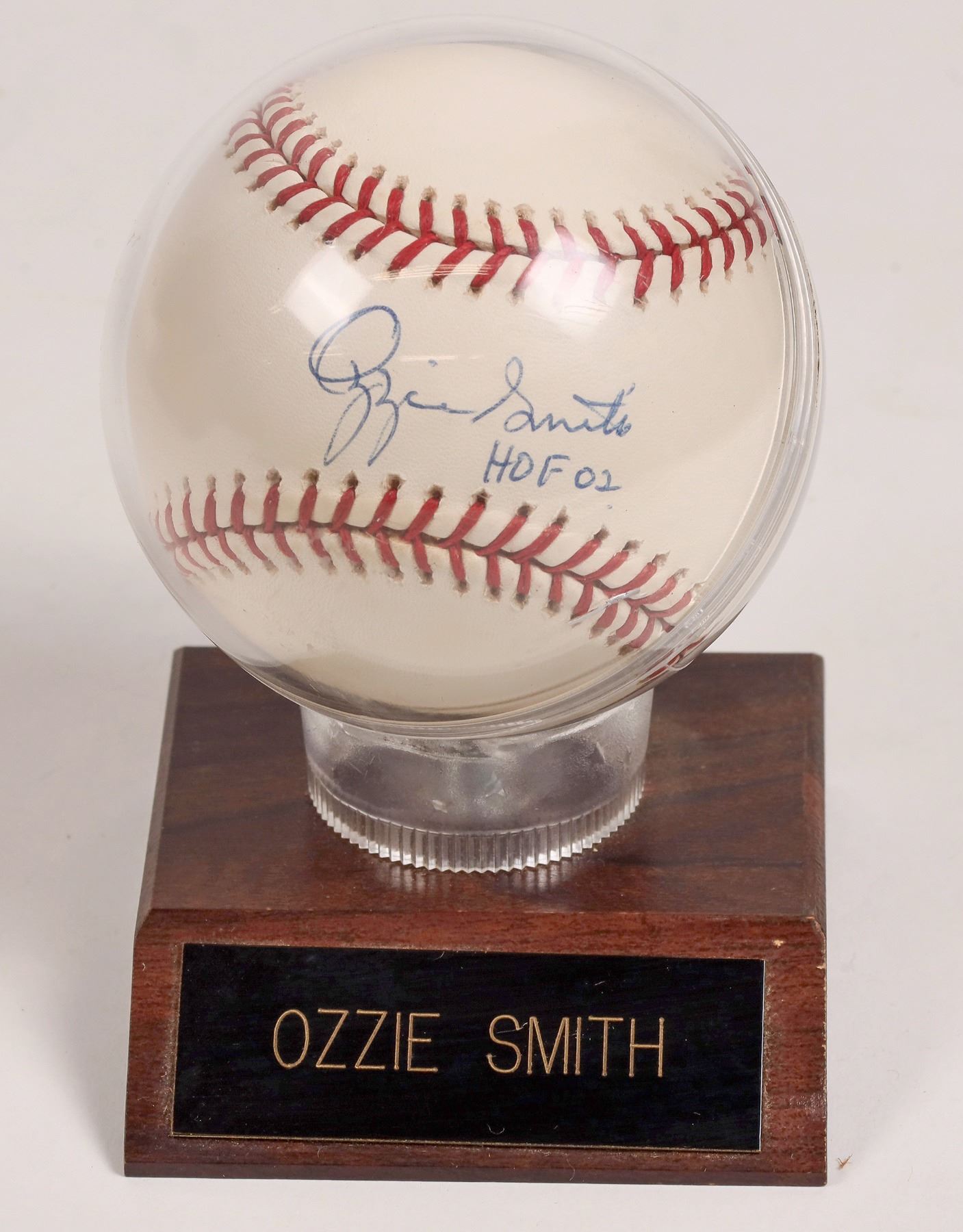 Rawlings baseball autographed "Ozzie Smith/HOF 02" in plastic case with brown wood base and name plaque. Guaranteed Authentic/Goldin Sports sticker on back. "Nicknamed "the Wizard of Oz", Smith played shortstop for the San Diego Padres and St. Louis Cardinals in Major League Baseball, winning the National League Gold Glove Award for defensive play at shortstop for 13 consecutive seasons." from Wikipedia