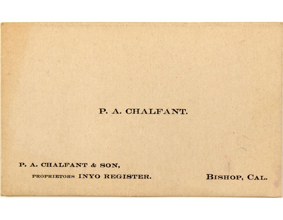 An early Inyo County pioneer. In his nineteenth year, P. A Chalfant joined a party bound for California. That party traveled part of the distance in company with unfortunates who soon after perished in and gave its name to Death Valley. Separating from them, he and his companions chose a course further north and late in 1849 crossed the Sierras into northern California. With J. E Parke established the Inyo Independent in 1870. As an editor he was able, forceful and fearless, and under his chief-editorship the Independent attained a prominent place is coast newspaper circles. In 1881 he sold the newspaper. [Obituary]