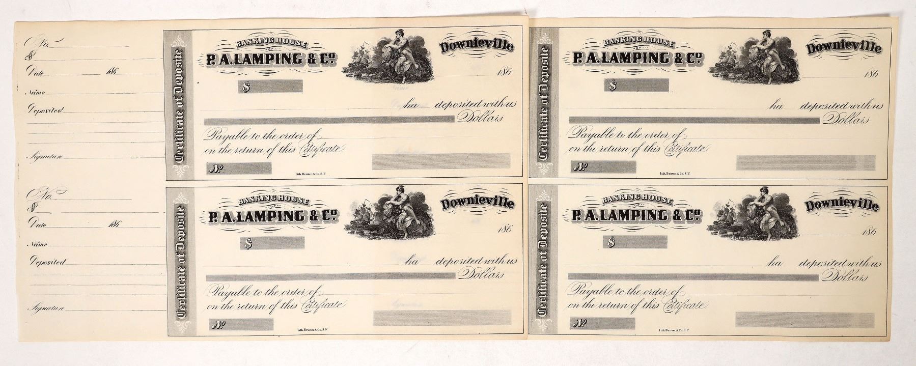 2 pairs of uncut Banking House of P A Lamping & Co c. 1860's checks.