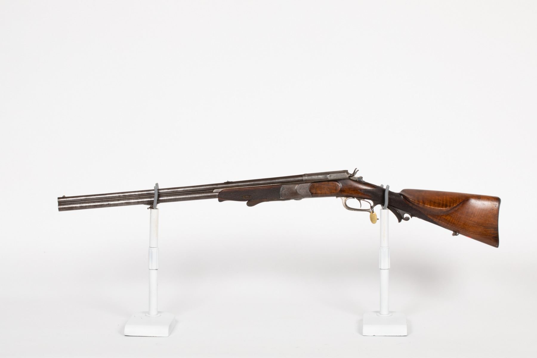 This is a highly ornate lever-action shotgun made in Germany; chambered 6.5mm and 16 ga. The gun is built with a severe off-cast for a right-hand shooter. A very rare specimen engraved. SN: 51218, JMD Oval Tag: 4173, Condition: Very Good, >