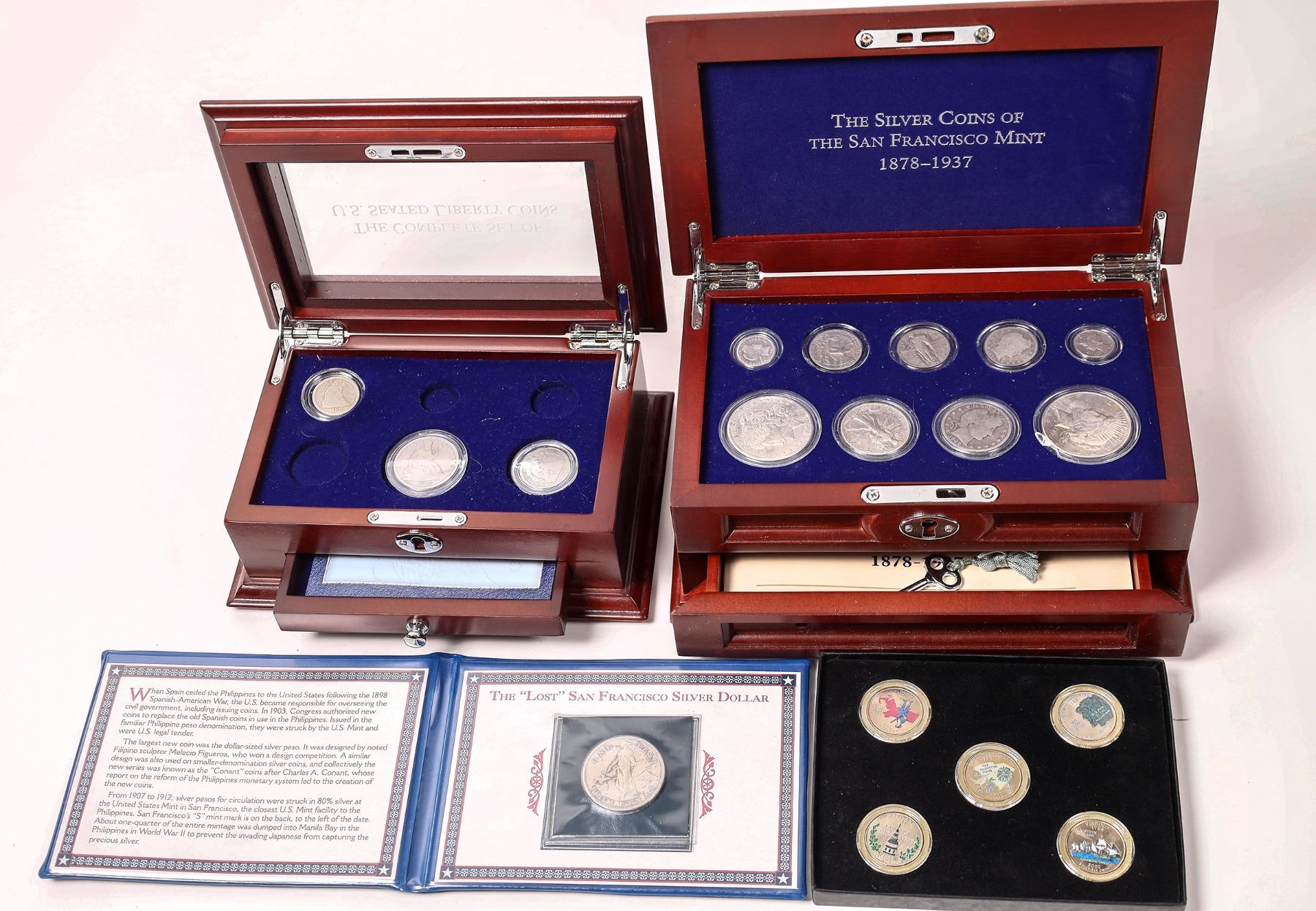 Miscellaneous offerings from PCS Stamp & Coin. 1) The "Lost" San Francisco Silver Dollar (1908 Philippine peso coin), VG-F condition. 2) Five enameled statehood quarters. 3) U. S. Liberty Seated coins in a glass top wooden case, (8 x 5 x 4 inches) with three coins: 1860 quarter (AG); 1875 twenty cent piece (AG); 1875 half dollar (AG-G). 4) Wooden case (9 x 6 x 4 inches) containing The Silver Coins of the San Francisco Mint 1878-1937. Nine coins: Morgan dollar; Peace dollar; Walking Liberty half; Barber half; Barber dime, Washington quarter; walking liberty quarter; Barber quarter; Mercury dime. Coins range from VG-EF condition.