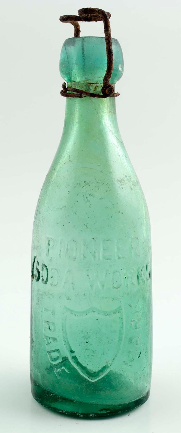 Pioneer / Soda Works // Trade ( cd) ( monogram - Shield ) Mark ( cu) . Smooth base. Pale greenish aqua. 1/2" lip chip in top, 1/2" open bubble, intersecting the letter 'S" in then word "Soda", and 4, 1/8' chip son the base. Nice overall body condition, clean, and rare with original wire closure, in WORKING condition. State: California City: San Francisco, Cal. Date: 1877-1896 HWAC# 29740