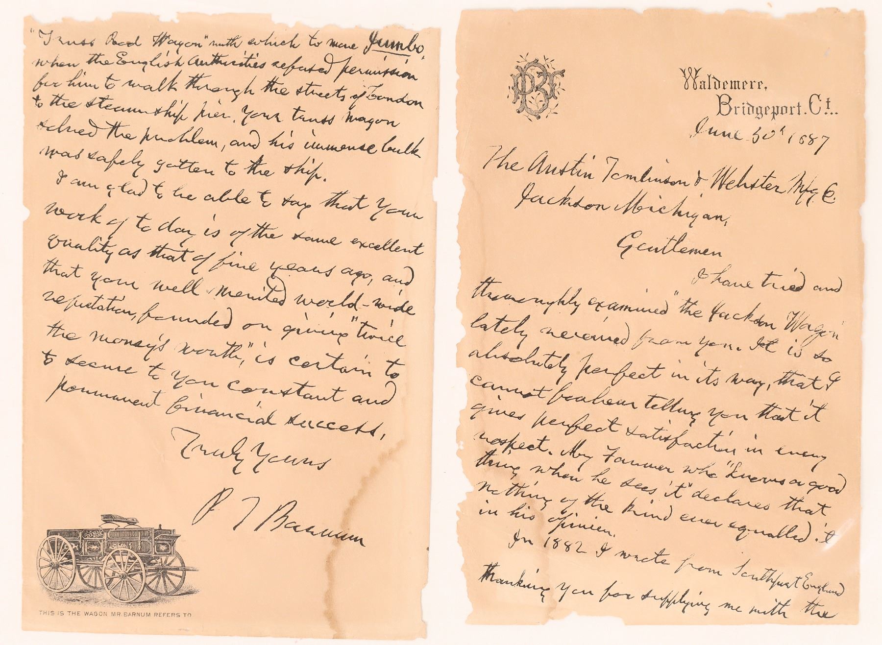 1887 PT Barnum wagonbuilder promotional letter with wagon vignette on page 2. This is obviously a promotional letter from a wagon company in which Barnum states he is very happy with the company's wagon. High quality reproduction of Barnum's letter with good contrast. 6.75x4.5". Water stains, please inspect.