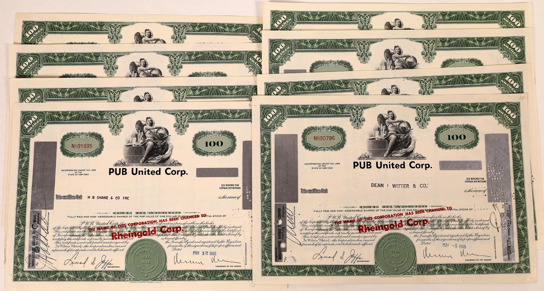 Lot of 8 stocks issued in 1965, punch cancelled. Green border, allegorical vignette. This company was the chief bottler for Pepsi before becoming the Rheingold Corp. and focusing on beer.