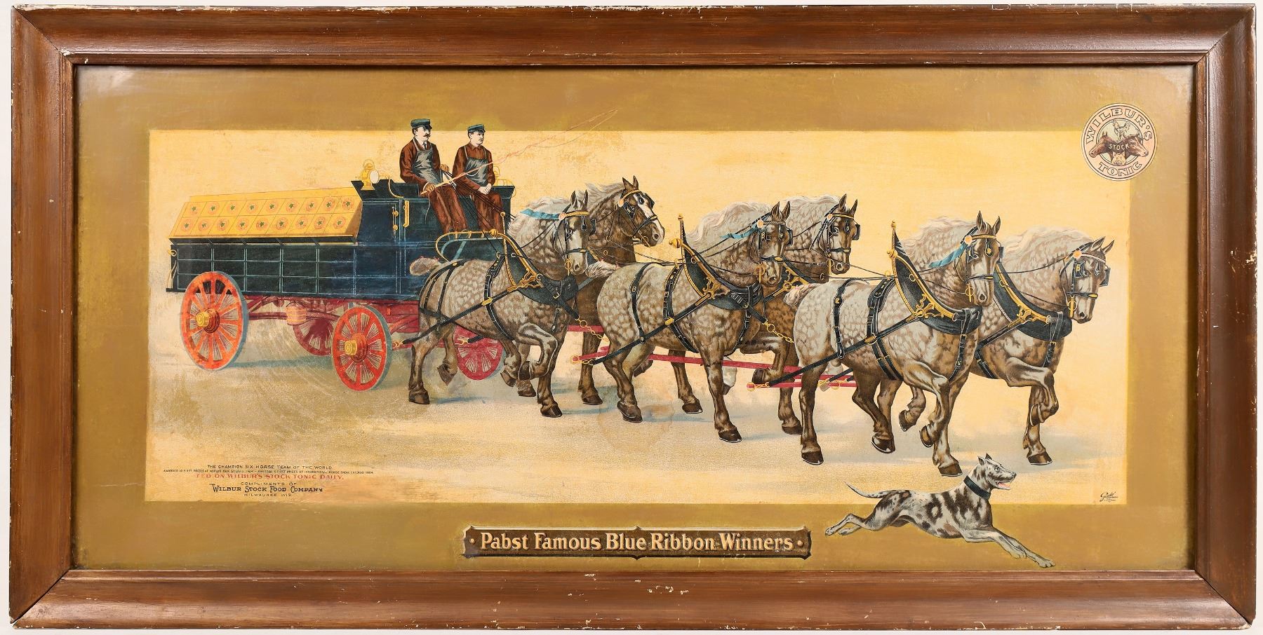 Original frame with Pabst Famous Blue Ribbon Winners advertising art print. A team of draft horses is pulling the beer wagon with a dog running along side. c. 1905, Compliments of Wilbur Stock Food Co., Milwaukee, WI. Print 13.75x30" with 2" round center stain. Frame 16.5x34". Milwaukee Wisconsin c.1905