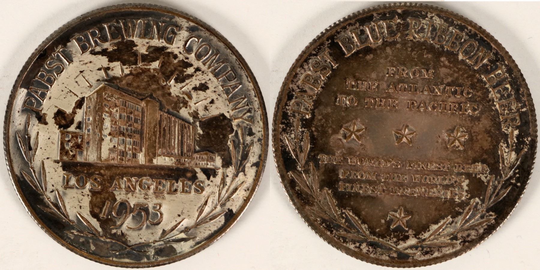 Appears to be a silver plated brass medal shows brewery on the front. Pabst Brewing Company, Los Angeles, 1953. On the verso, "Pabst Blue Ribbon Beer, From The Atlantic to the Pacific, The World's Finest Beer, From the World's Finest Breweries. 38.5 mm.