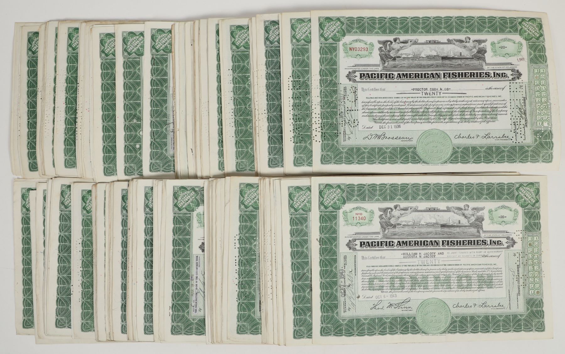 Pacific American Fisheries, Inc. Stocks c1936-1948 About 300 green border issued stocks. Pacific American Fisheries, Inc. (PAF) was a major salmon packing company in Bellingham, Washington, founded in 1898 by Roland Onffroy and incorporated in 1899 with major operations on the Puget Sound and in Alaska. It grew to become the world's largest salmon cannery, operating numerous canneries and a large complex in Bellingham with a shipyard, can factory, and housing for workers. The company's decline began with Alaska's 1956 ban on salmon traps and concluded with its 1966 closure. See photos.