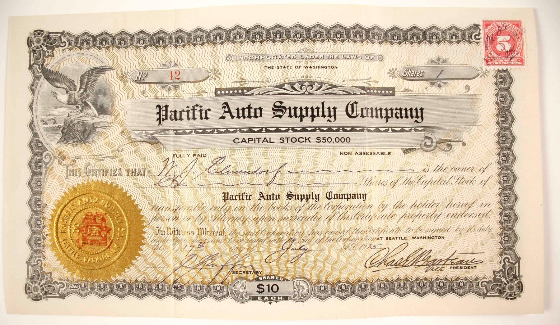 I/U #12 WJ Elmendorf 1 share, 1915. Revenue stamp. Nice re auto vignette inside gold seal.