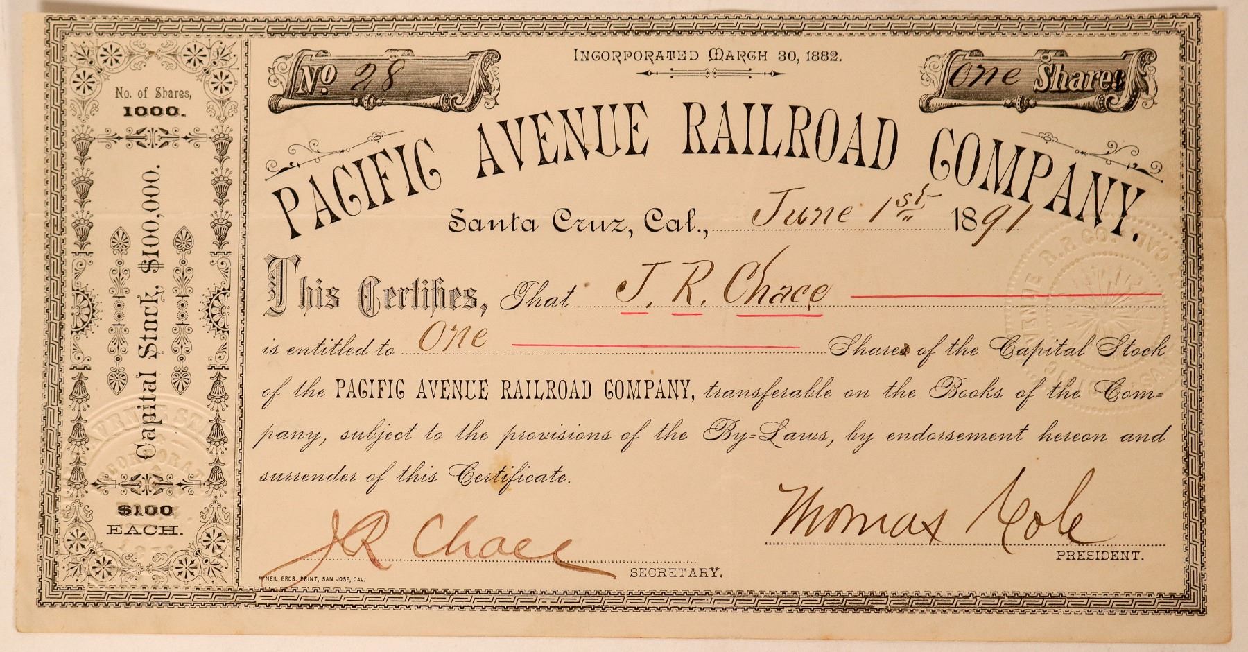 Extremely rare railroad stock issued in 1891. Listed in Cox, but no example pictured. Incorporated in 1882. Electric streetcars replaced horsecar railroads in Santa Cruz and in 1891 began service(santacruztrains.com). Cert. #28 was issued to J.R. Chace for one share and signed by Chace as secretary and Thomas Cole (illeg) as president. Not seen before by us. Mcneil Bros. print, San Jose. VF. Uncancelled.