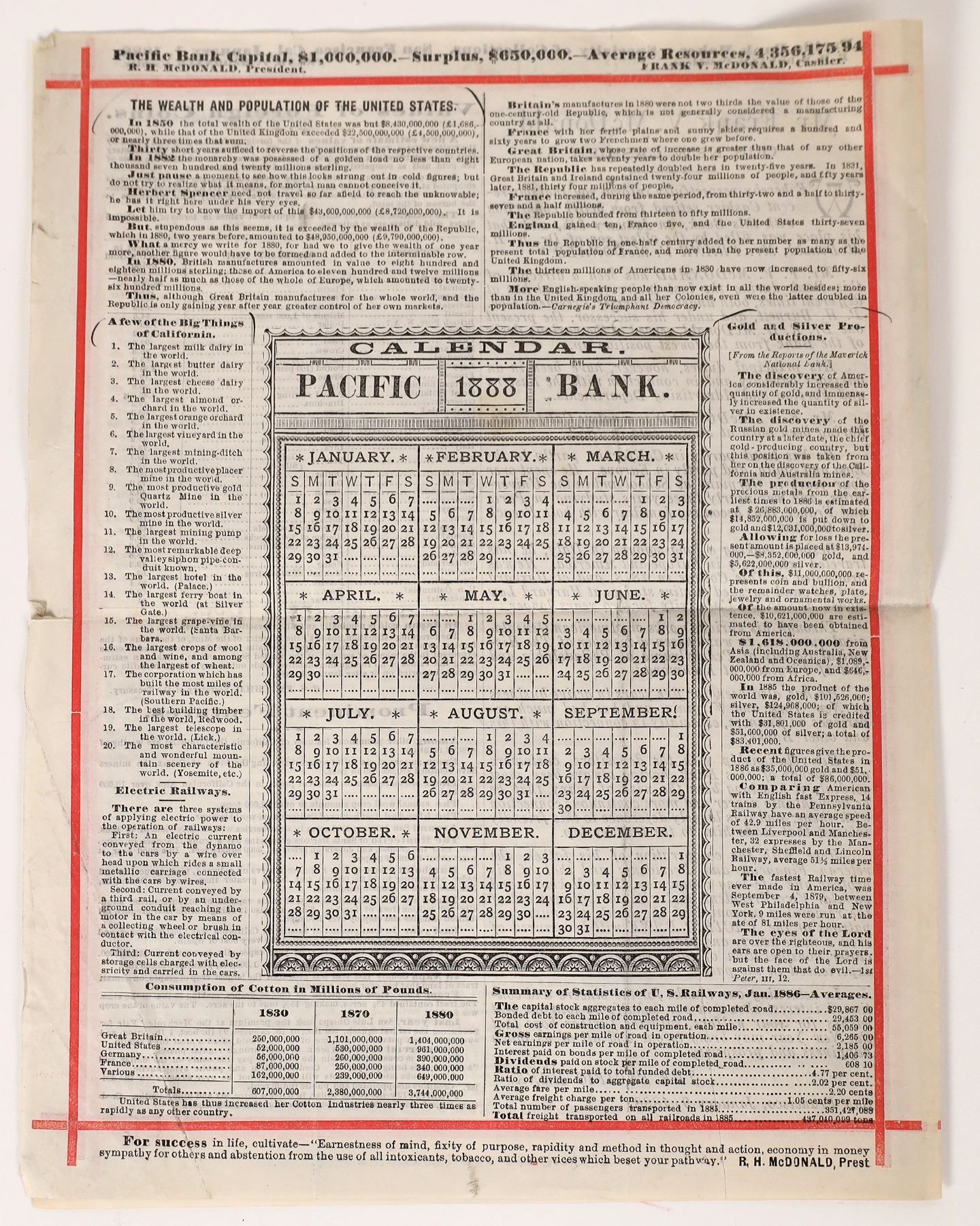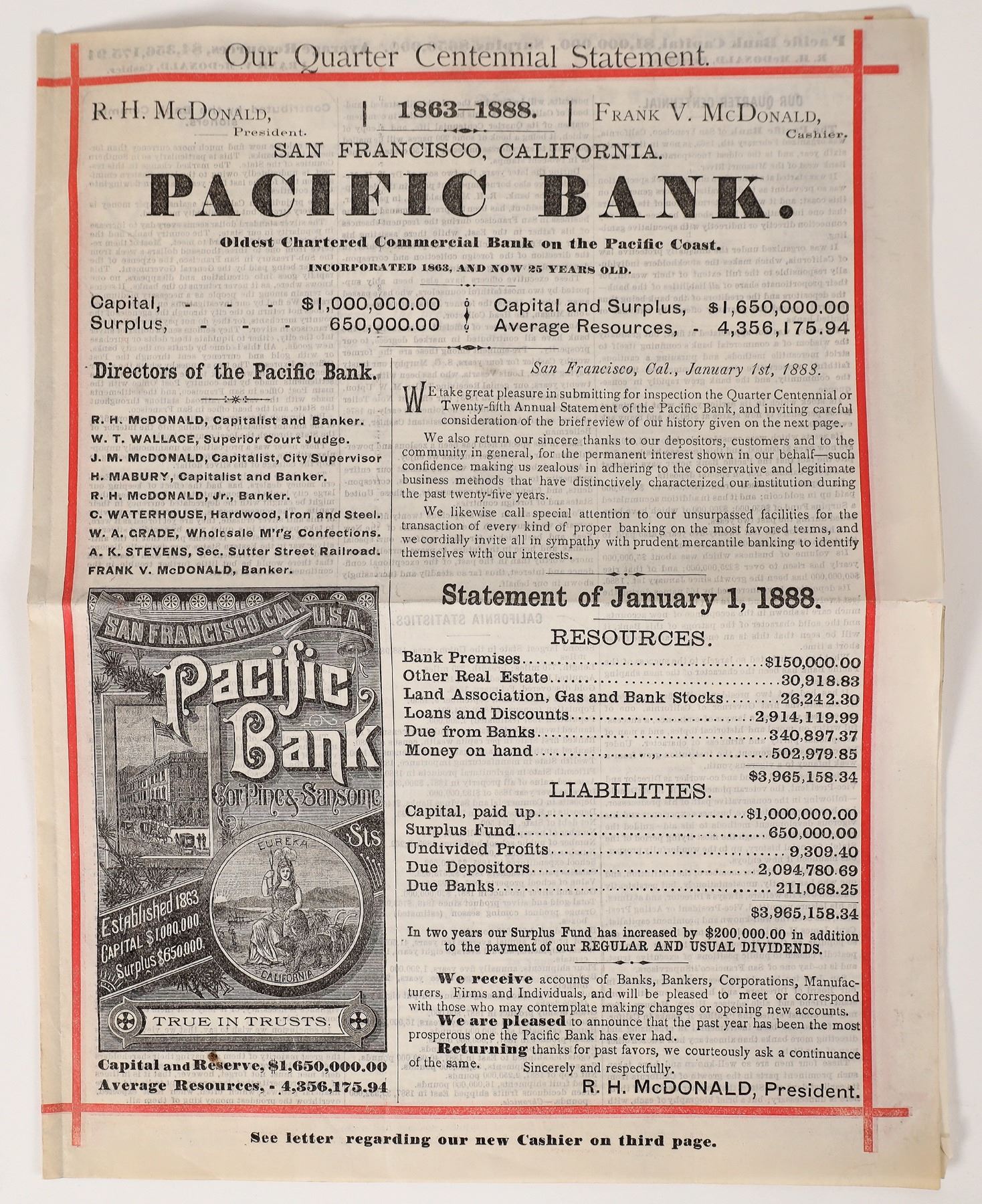 Rare 1882 Quarter Centennial Statement from Pacific Bank. Back page has interesting timeline of the wealth and population of the US. Some edge wear, crease and small pen brackets. 11x8.5". California San Francisco