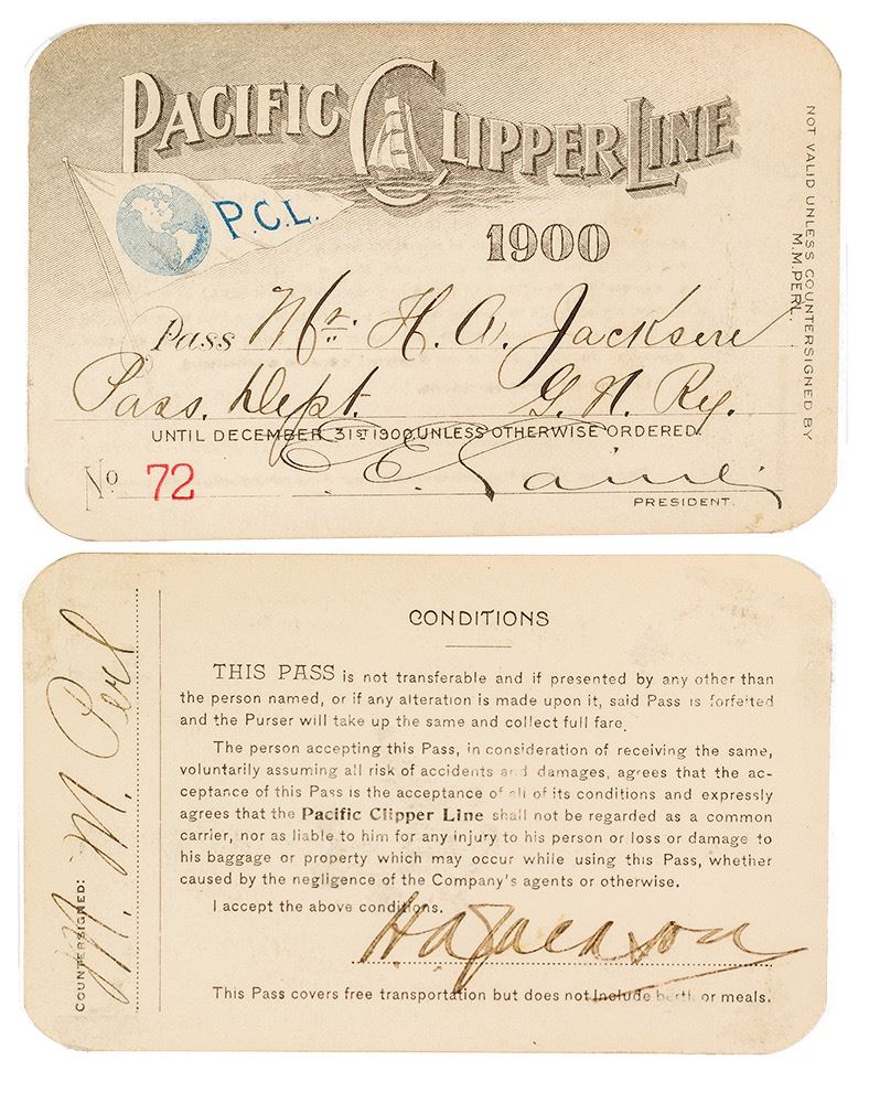 No. 72, issued to H.A. Jackson (Great Northern Railway) for the year 1900. Signed by E.E. Caine as president and M.M. Perl. Endorsed on reverse by Jackson. Printed on cardstock with some soiling. Ornate logo with a vignette of a sailboat on water. Gold rush! Operated from Seattle to Nome and St. Michel. (Prag Collection) City: State: Washington Date: Inventory# 39200