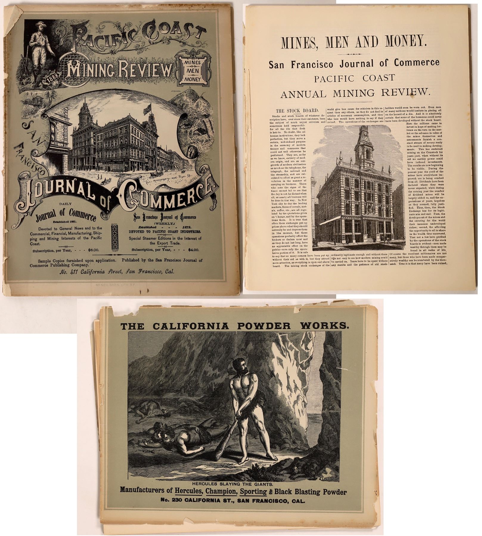 Published by San Francisco Journal of Commerce. Inside: Articles on the Comstock Lode, Biographical info on important figures Adolph Sutro, William Stewart. Maps of the : the main tunnel from Sutro, Section view of the Comstock Mines. 94 pages not including the covers. Good, but delicate condition.