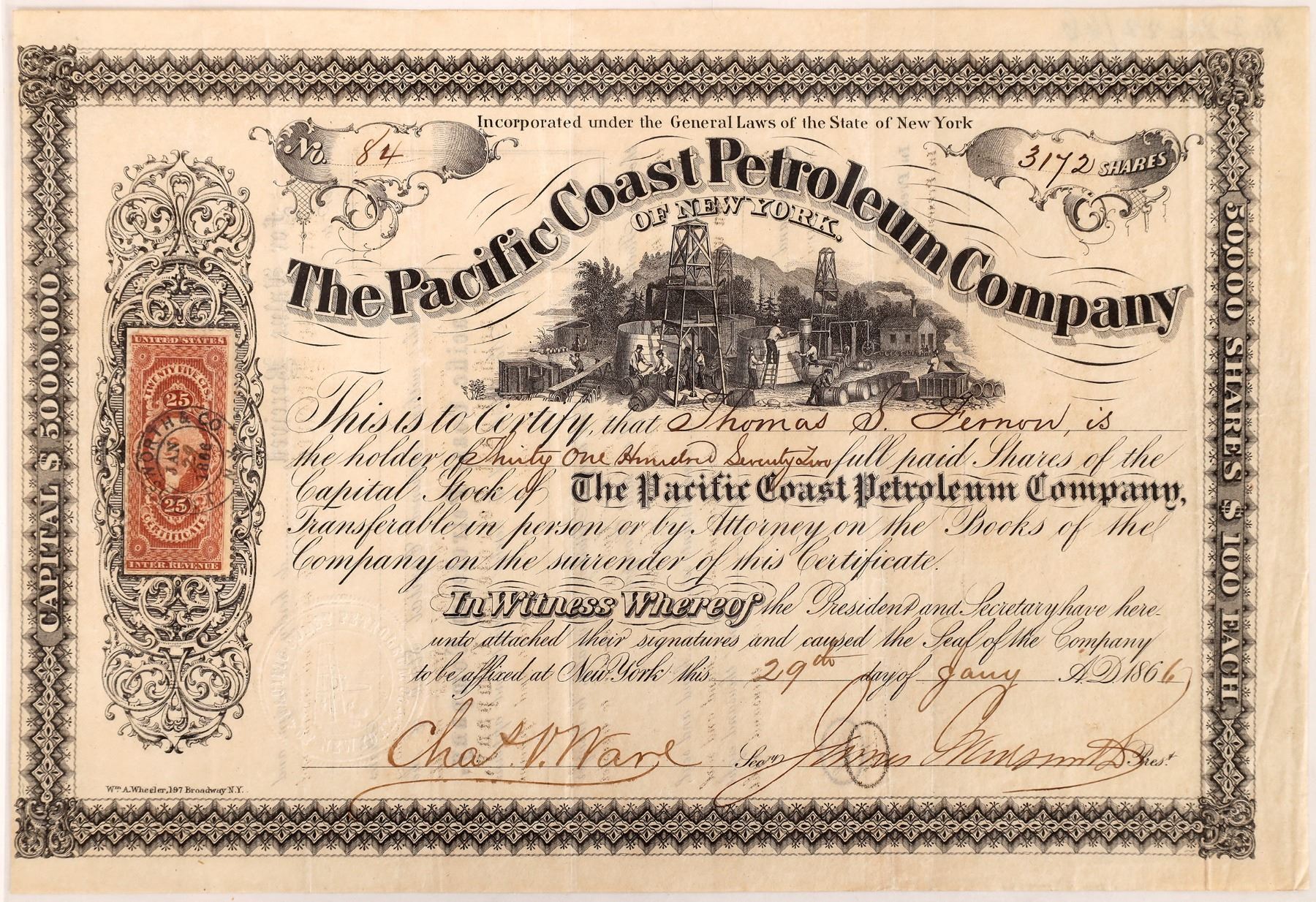 Inc. in New York. Properties in San Luis Obispo County, California. 75,000 acres including the Manuela Ranch, Arroyo Grande Ranch, Balsas Chemical Ranch, the Pisma Ranch, and Stone Corralt Ranch [Buffalo Evening Post, 23 Feb 1865]. No 84, issued for 3,172 shares to Thomas Fernon in New York in 1866. Signed by president James Wadsworth and secretary Chas. Ware. Not cancelled. Black border and print with vignette of oil derricks and men loading barrels. 25 cent US IR Certificate revenue stamp with tied cancel. Printed by Wm. A. Wheeler, NY. 7 x 10.5" Folds, creases. Rare, early California oil stock! San Luis Obispo County California Ken Prag Collection