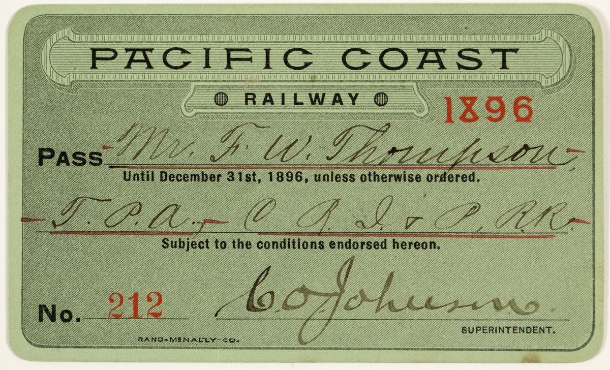 No. 212, issued for 1896 to F.W. Thompson, Chicago, Rock Island & Pacific Railroad. Signed by C.O. Johnson as superintendent. Printed on green cardstock by Rand McNally & Co. Some toning/soiling. (Prag Collection) City: State: California Date: Inventory# 41020