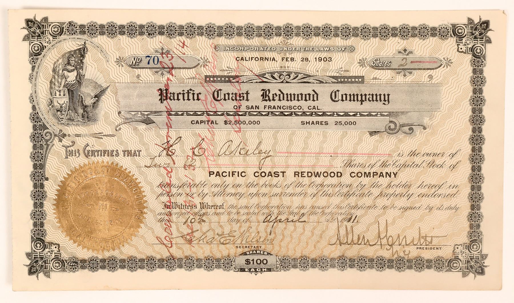 Very nice and scarce Mendocino County stock. Red pen cancels. VF.