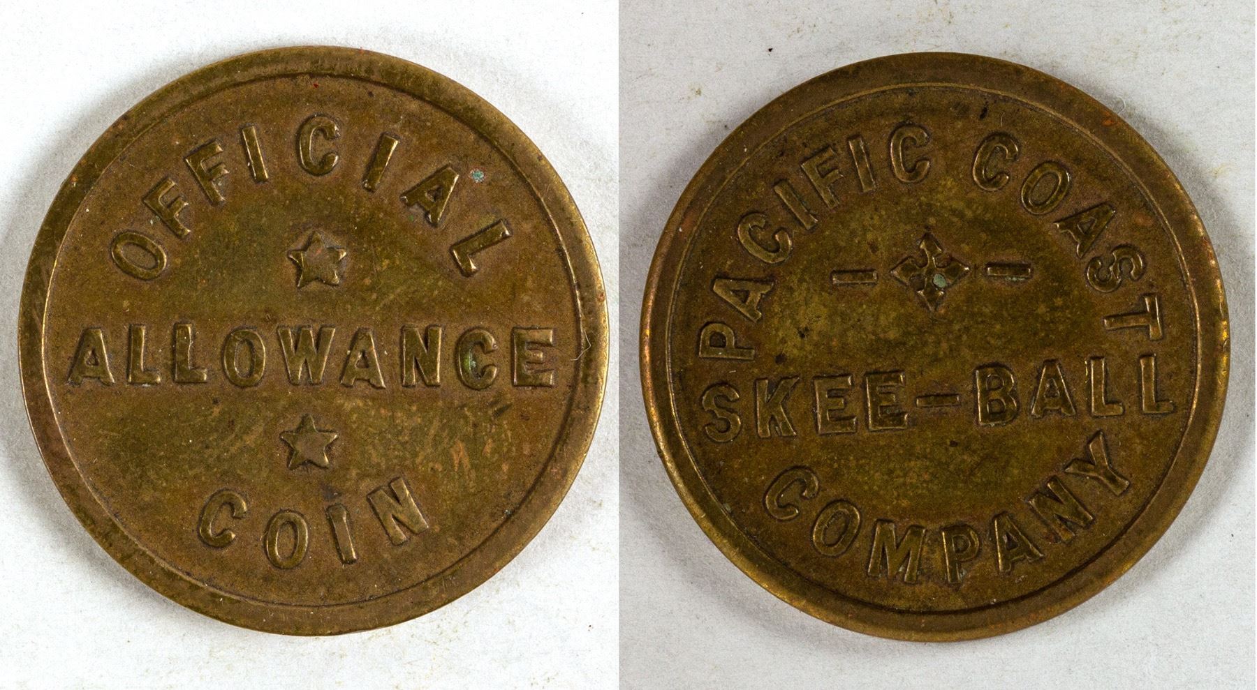 Obv.: Pacific Coast / Skee-ball / Company; Rev.: Official / Allowance / Coin. Br., rd., 22 mm. Daniel Manasselian Collection. State: City: Date: ID# 77776