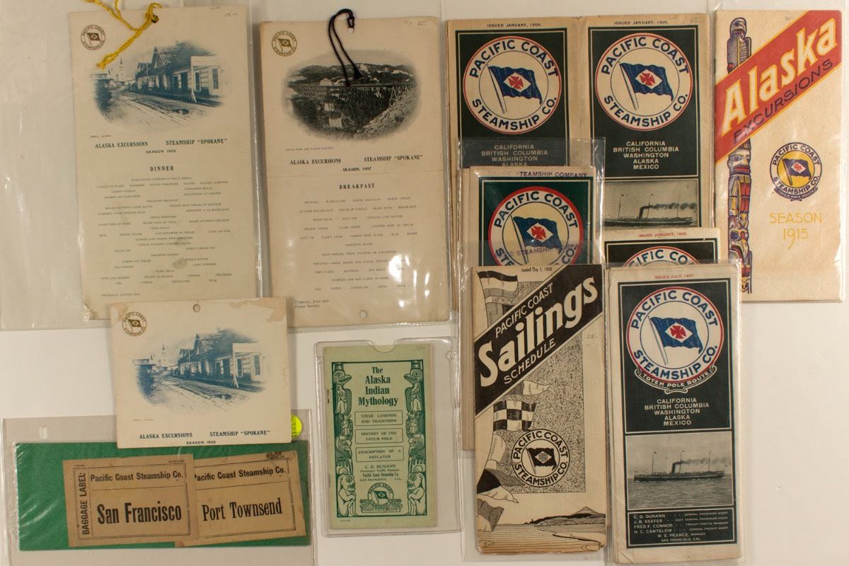 Eleven items. includes Alaska Excursions 1915, maps, baggage tags, menus, brochures, informational booklets, and schedules. One Steamship Spokane autographed piece from James Carroll. Carroll brought the first large steamboat to Alaska. He was the first master of the Queen and was the first to take her through the Wrangell Narrows; Carroll Glacier is located at Queen Inlet in Glacier Bay National Park and Preserve. Nice 100 year old historic Alaskan piece. City: State: Alaska Date: 1906 and later hwac# 21671