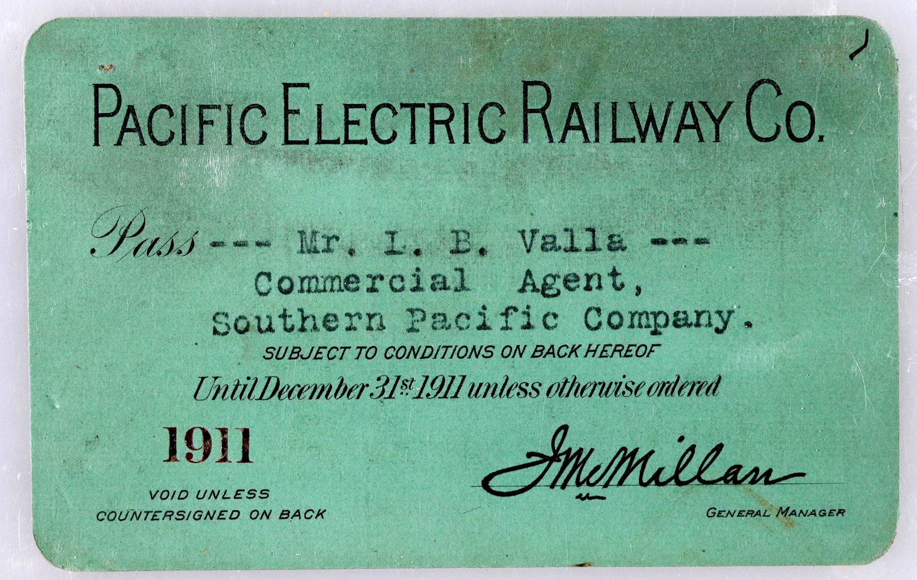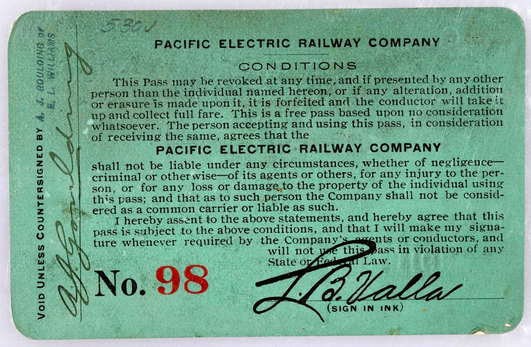 #98 issued 1913 to L E Valla, Southern Pac Co. signed GM. blue cards stock, handwriting print style title top center, reverse not readable, unk printer. Operational in 1901 electric rail system in Los Angeles and surrounding area. Known as the "Red Cars", and was the largest electric system in the world in the 1920's. Merged into the SP in 1965.