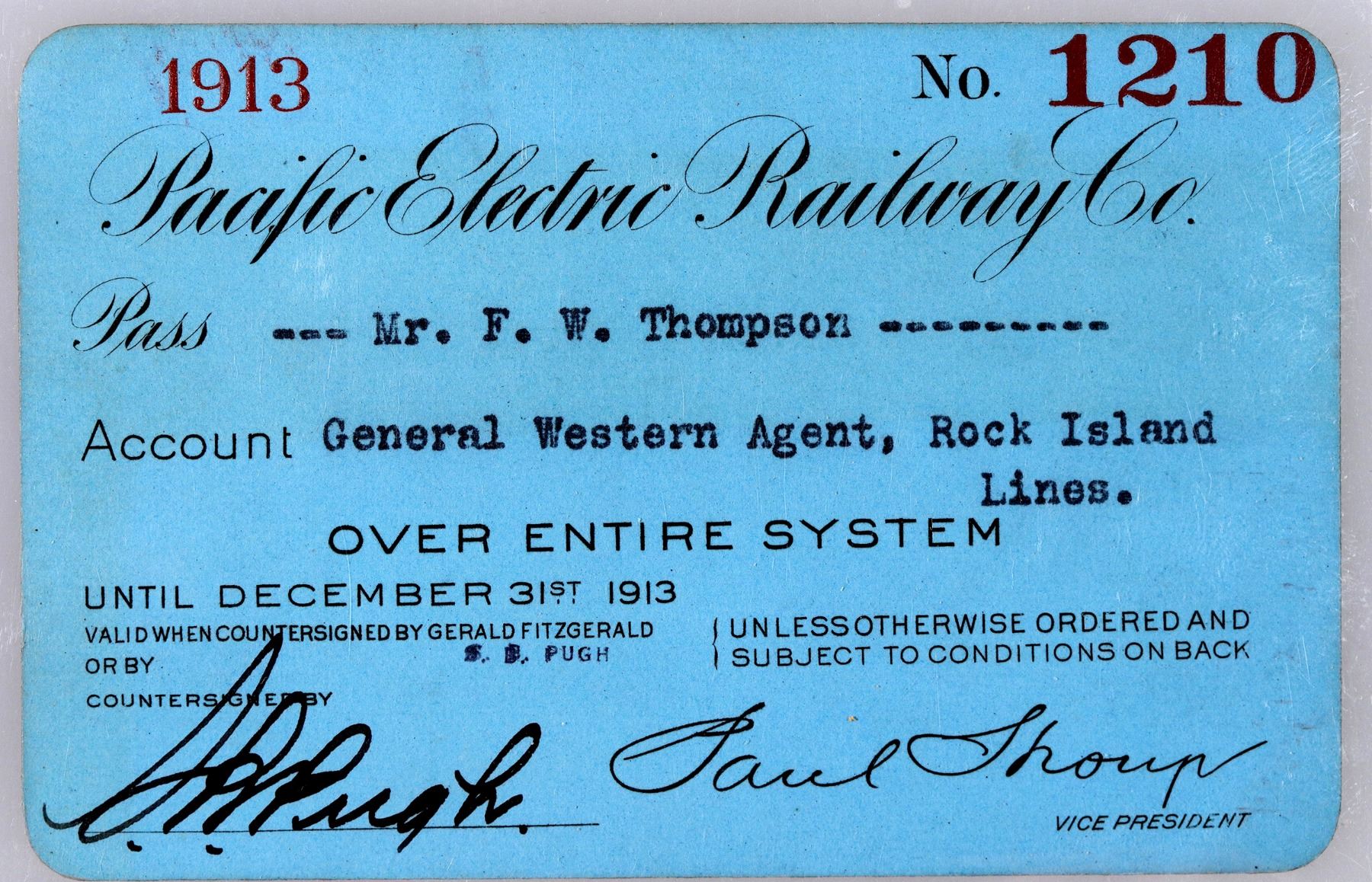 #1210 issued 1913 to F W Thompson, Over Entire System, Rock Island Lines, signed VP. Blue cardstock, handwriting print style title top center, reverse illegible, unknown printer. Operational in 1901 electric rail system in Los Angeles and surrounding area. Known as the "Red Cars", and was the largest electric system in the world in the 1920's. Merged into the SP in 1965.
