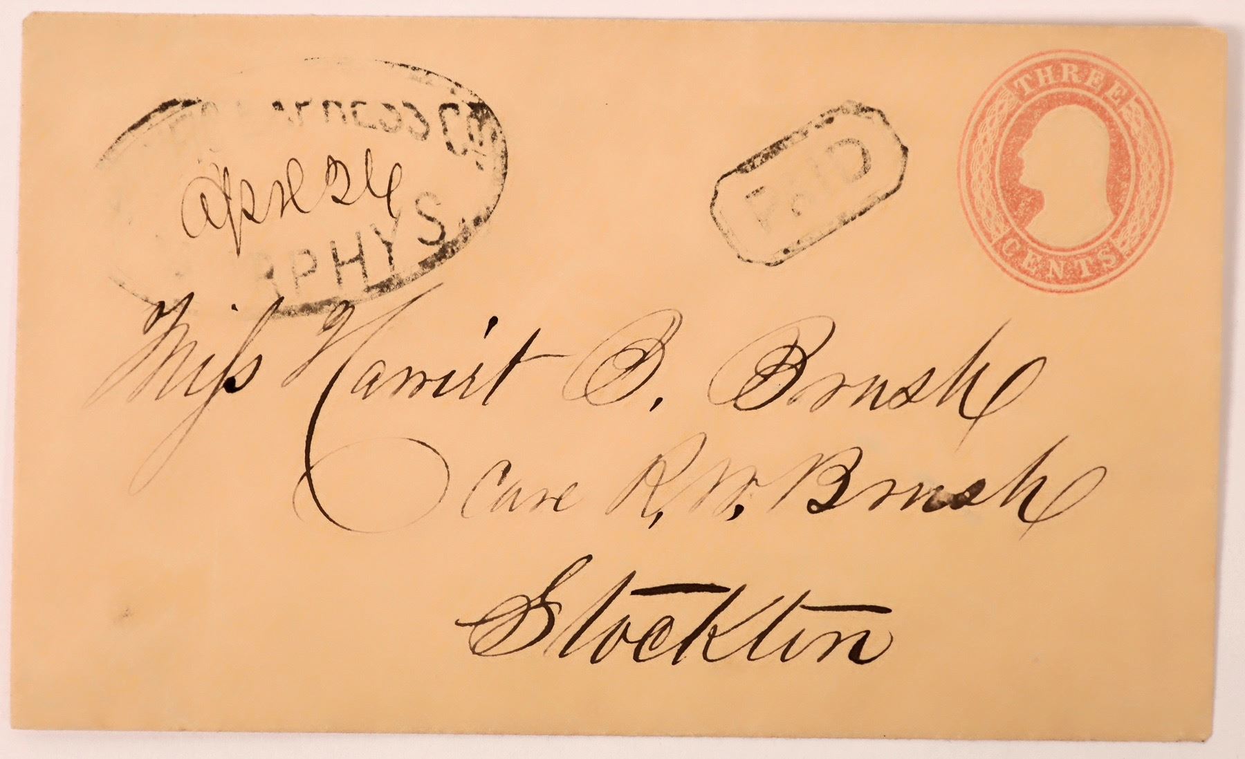Pacific Express Co. Murphys. VERY RARE stamp. PAID stamp. Addressed to Miss Brush in Stockton. 3c U4 red stamp. Early. The area around Murphys (Calaveras County) was originally occupied by the Miwok. John and Daniel Murphy were part of the Stephens-Townsend-Murphy Party, the first immigrant party to bring wagons across the Sierra Nevada to Sutter's Fort in 1844. They earned a living as merchants, but like many others, began prospecting when the California Gold Rush began. They first started in Vallecito, which was then known as "Murphys Old Diggings."