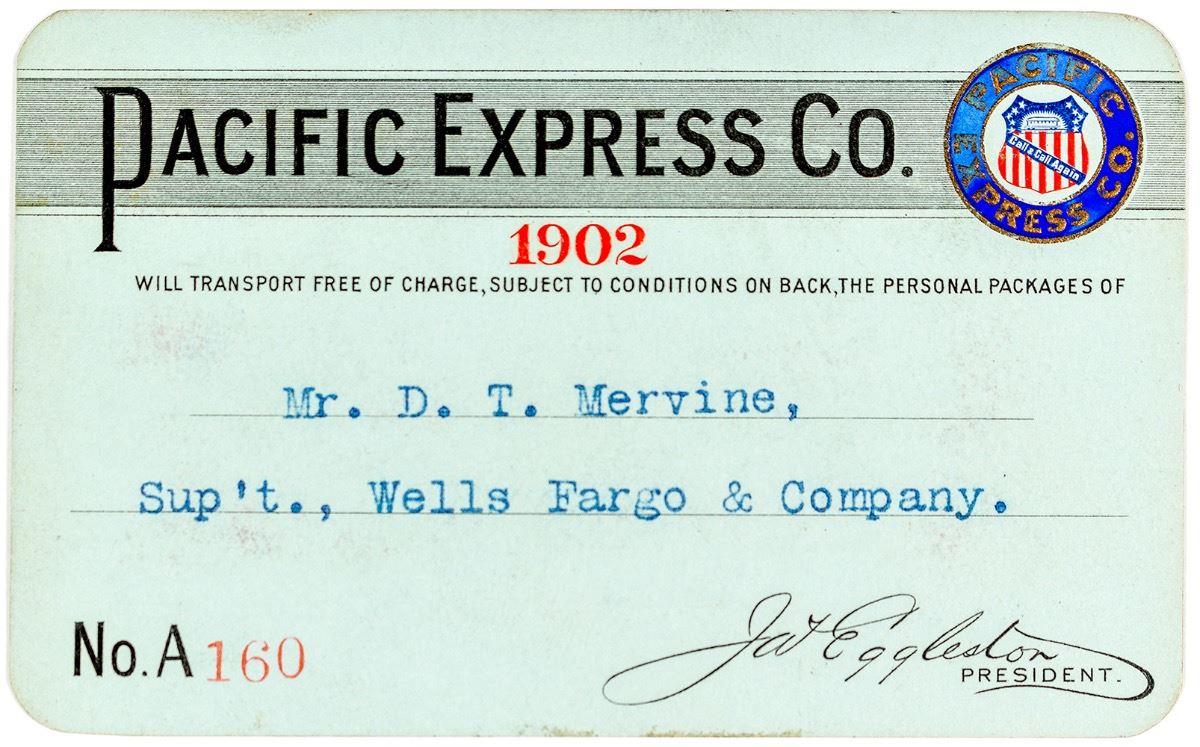 Pass No. A160, issued in 1902 to D.T. Mervine, superintendent of Wells Fargo & Company. Printed on blue cardstock. Reverse is countersigned by L.D. Carlson, secretary to president. Minor wear. (Prag Collection) City: State: Date: Inventory# 39142