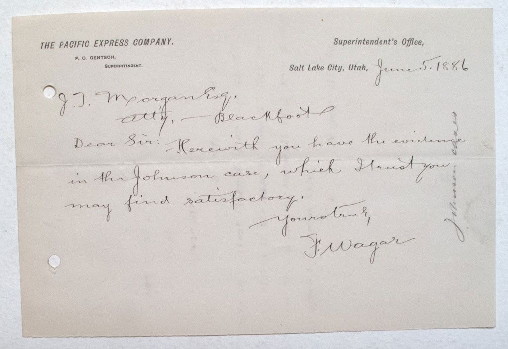 From J Wagar to J. T. Morgan. About the Johnson case? Date Salt Lake City, UT hwac 9535