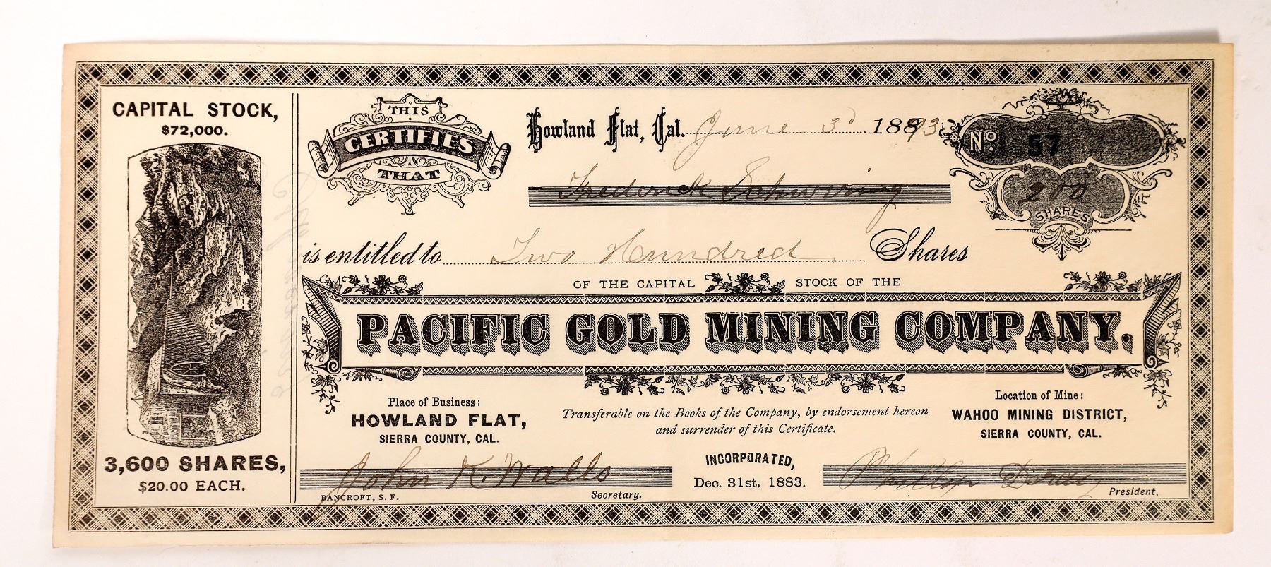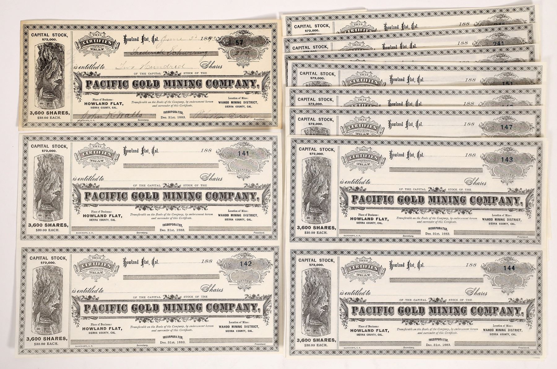 Lot includes: 18x stock certificates, unissued, for the Pacific Gold Mining Company, incorporated December 31, 1883, No. 141-152 and 239-246. No. 239-246 still have edge receipt attached. Each is datelined Howland Flat, California. with mines listed as located in the Wahoo Mining District, Sierra County, Cal., printed by Bancroft S.F., large detailed vignette of Mill house with water wheel, in the mountains, with lone figure by the river. Black print on white. Certificates are pristine and in excellent condition; 1x stock certifcate for the Pacific Gold Mining Company, No. 57, datelined Howland Flat, California, June 3, 1893, issued to Frederick Schwering for 200 shares. Singed by John K. Walls (sec), and Phillip Daras(?) (pres). The Pacific Gold Mining Company operated from 1883, when it was incorporated, until 1928. Many Chinese were employed as contract laborers through Ah Tye of La Porte between 1884 and 1888. Garvis Collection. Sierra County California