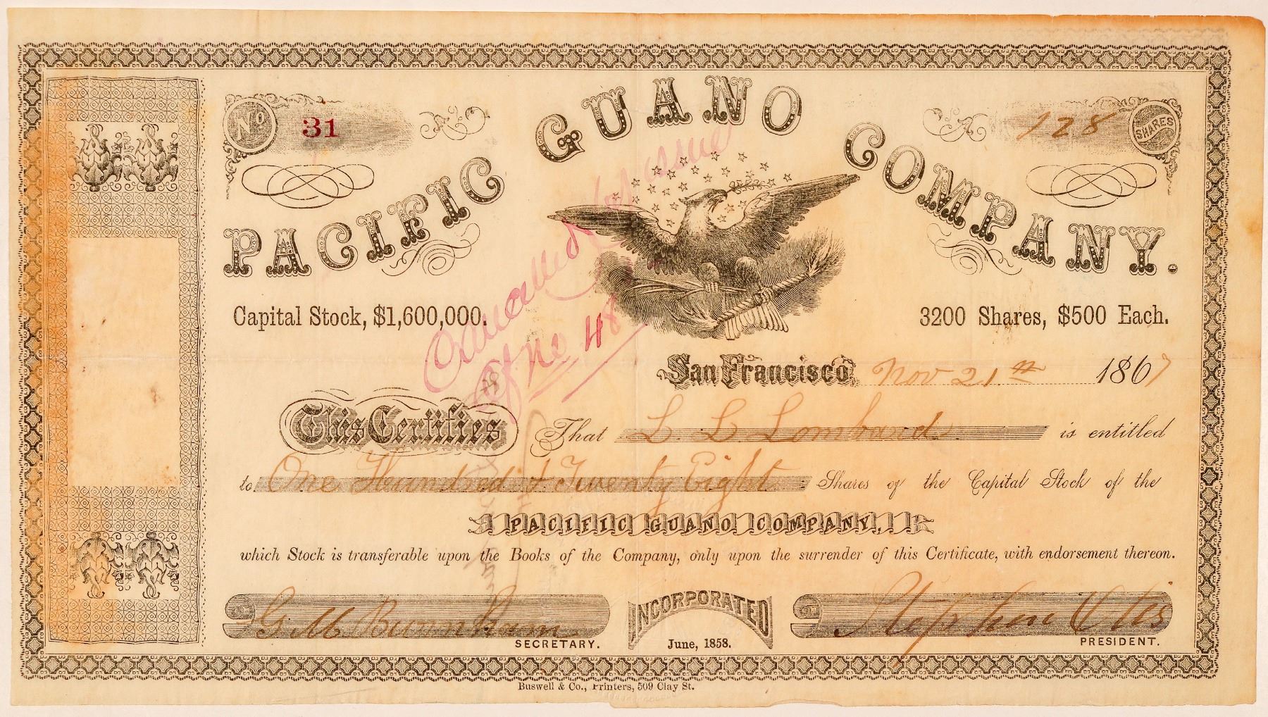 We have had many unissued, but not many issued. Inc. June 1858. No 31, issued for 128 shares to L.L. Lombard on Nov. 21st, 1867. Signed by president Otes and secretary GM Burnham. Pen cancelled. Black border and print, eagle vignette. Folds, heavy toning. 5.25 x 9.5" The Pacific Guano Company was for twenty-six years (1863 –1889) the principal industry of Woods Hole. It was the result of the association of the Boston shipping firm of Glidden and Williams and two Cape Cod families. The islands along the west coast of South America were found to have guano (bird dung) several hundred feet thick, which was used in fertilizer. Ken Prag Collection