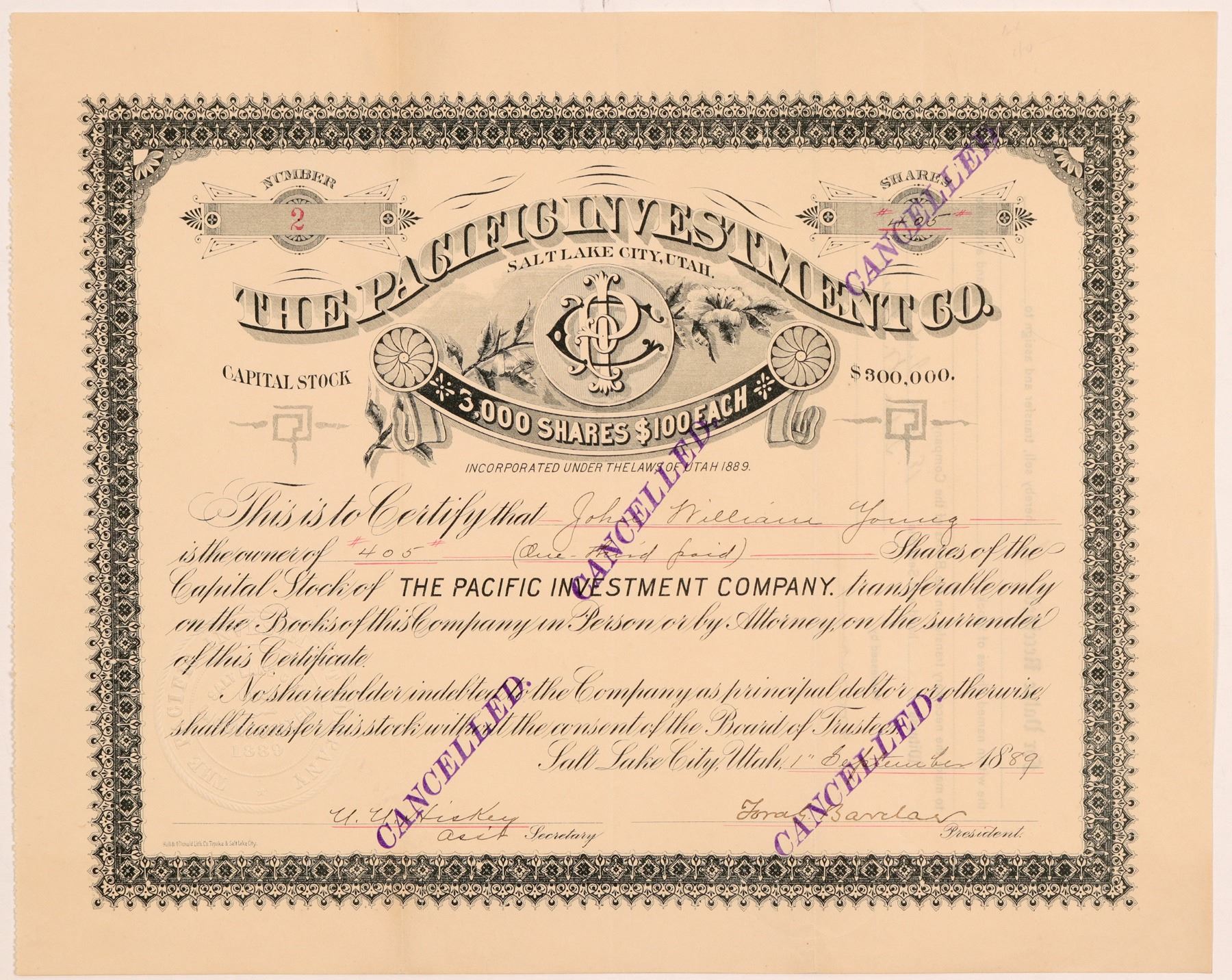 Inc. in Utah, 1889. Stock number TWO, issued for 405 shares to John William Young on Sept. 1st, 1889 in Salt Lake City. Signed by president Bardar and asst. secretary UU Hiskey. Stamp cancelled. Black border and print, fancy company logo with floral vignette. Printed by Hall & O'Donald. Heavy folds, toning. 8.75 x 11" This was a coal mining operation at Durham, King County, Washington, now a ghost town. Durham was situated on the banks of the Green River, 40 miles east of Seattle. According to an 1889 report from Northern Pacific Railroad, a 2.9 mile branch was completed to Durham in 1888 by the Pacific Investment Co. to develop their coal mines (pg. 43). In 1889, it was reported 100 men were employed with an expected output of 300 tons a day. [Ref: Colliery Engineer, Volume 9, 1889] Ken Prag Collection
