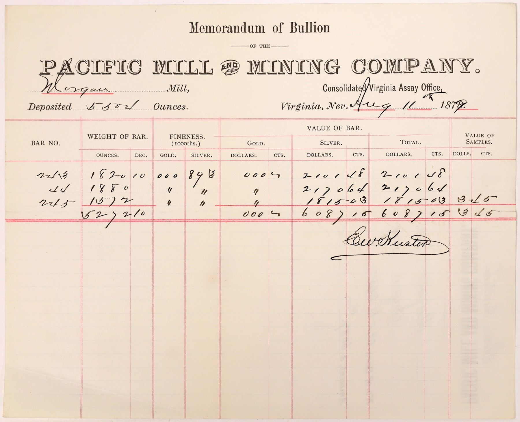 Very rare. We've only offered one of these over the past 10 years (and it was in poor condition). Assay memorandum for "sluice bullion" for the Morgan Mill, performed at the Consolidated Virginia Assay Office. 5,504 ounces made into three bars of silver bullion, .893 fineness. Signed by E.W. Kuster. 8.5 x 7" Fold, bent corner. The Pacific Mill & Mining Company was formed by the Bonanza Kings Mackay, Fair, Flood, and O'Brien to consolidate their mining and milling interests on the Comstock after the Big Bonanza discovery. The Morgan Mill was located on the Carson River just east of Empire City. It was built in the mid 1860s to process ore from the Yellow Jacket Mine in Gold Hill. Virginia City Nevada