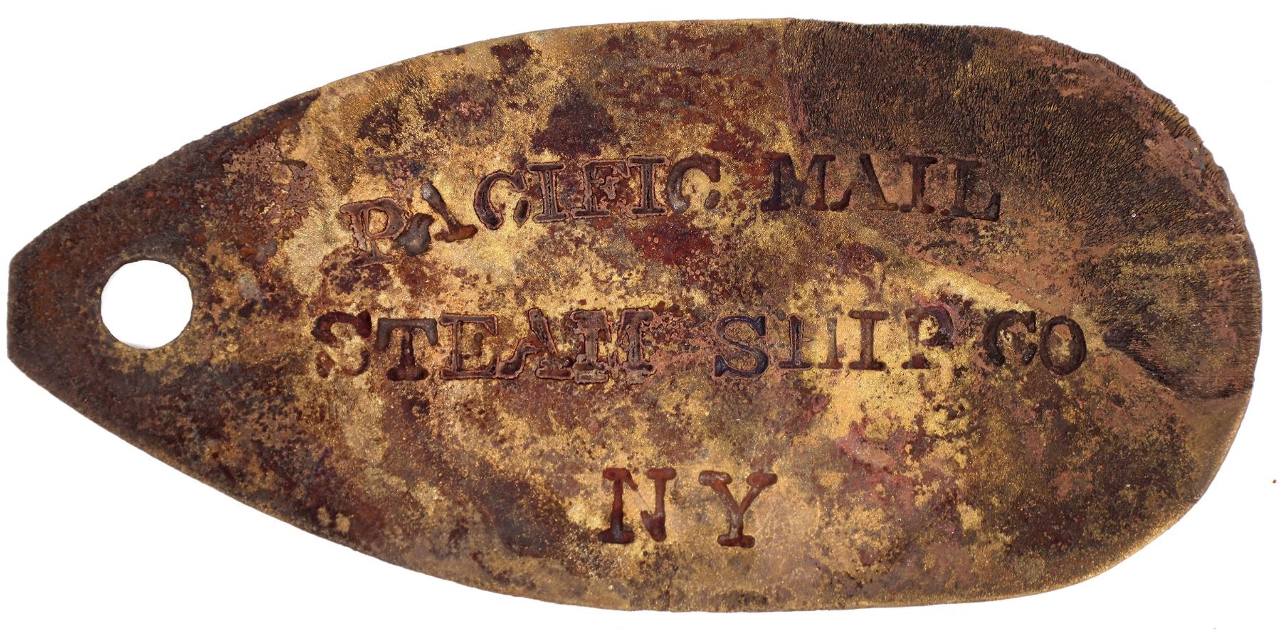 Wonderful Pacific Mail Steamship Company, N.Y. brass tag probably used for a mail bag. Oblong, 5" x 2.5", with individual letters punched in one side. This choice artifact would have been attached to one of the many U.S. Mail bags headed to New York from California. The P.M.S.S. controlled the routes on the Pacific side and the U.S. Mail and Steamship Co. controlled the routes on the Atlantic side. The mail would have originated in San Francisco, placed on the S.S. Sonora, offloaded at Panama, onto the Panama RR and across to Aspinwall on the Atlantic side for loading onto the S.S. Central America for its doomed voyage to New York. It is probably the only such mail bag tag extant today. Much has been written about mail shipped during the California Gold Rush particularly during the 1850s at the peak when several authors have opined that up to 10,000 letters were shipped on every New York bound voyage, which were spaced two weeks apart, month after month. This piece was found in one of the debris fields. No mail survived the sinking of the S.S. Central America, though many documents did that were preserved in the purser's safe.
