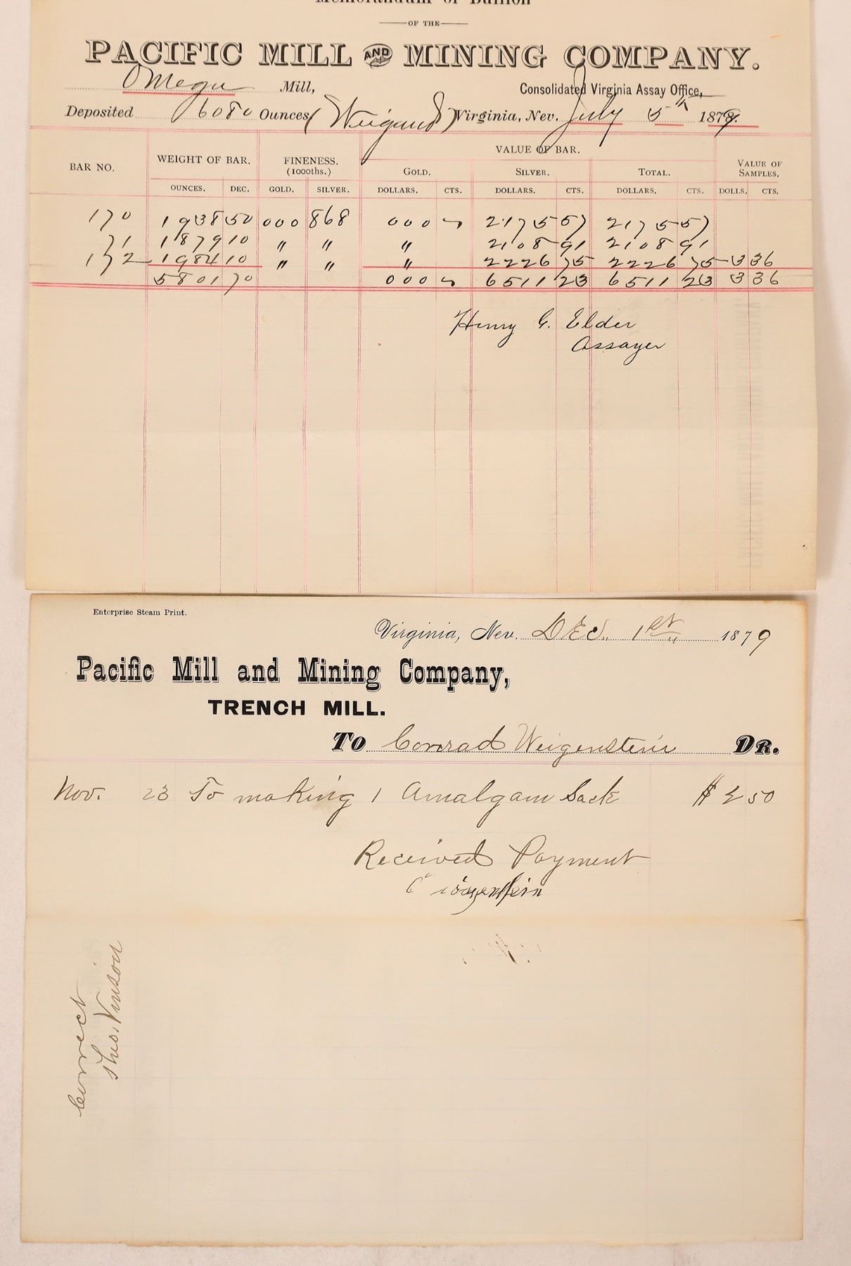 Lot of 2. 1) Pacific Mill & Mining Co. Memorandum of Bullion, Omega Mill, 6,080 ounces of "sluice bullion" deposited by Wiegand on July 5th, 1879. Three bullion bars produced: .868 fineness silver with no gold, valued at $6,511.23. Signed by assayer Henry G. Elder. 7 x 8.5" Wiegand was likely using the Con. Virginia Office as test check on other assays/mill results. The Omega Mill was a tailings facility built in 1876 by the Pacific Mill & Mining Co. at the mouth of Sevenmile Canyon on the site of the old Gould & Curry Mill. 2) Pacific Mill & Mining Co. Trench Mill billhead issued to C. Wiegenstein (assumed to be Wiegand) in 1879 for making one amalgam sack.